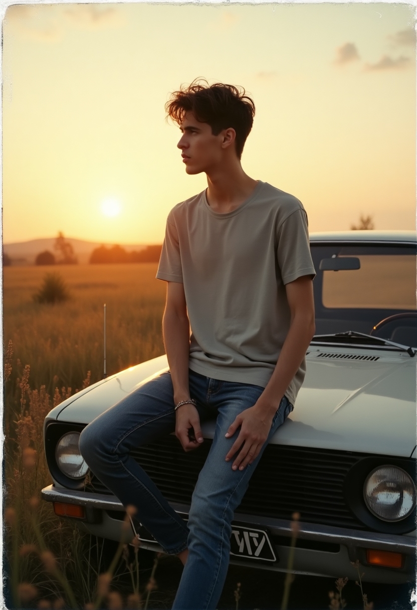 Фотография Полароида — мужчина в джинсах и футболке сидит на капоте старого автомобиля в поле, вокруг высокая трава и заходящее солнце