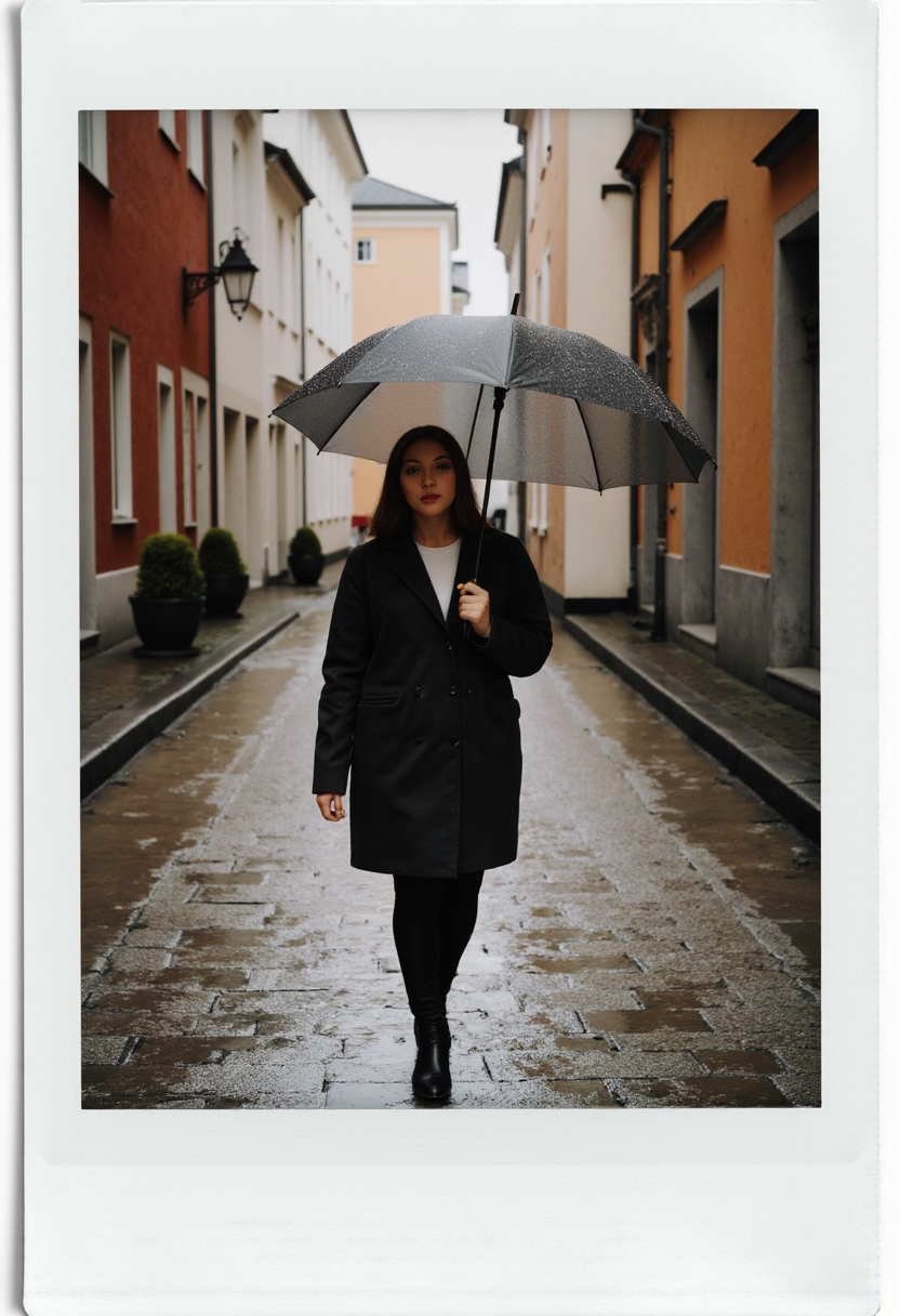 Фотография Полароида с белой рамкой — женщина с зонтом стоит под дождём на узкой улочке старого города, позади мостовая, отражающая капли воды