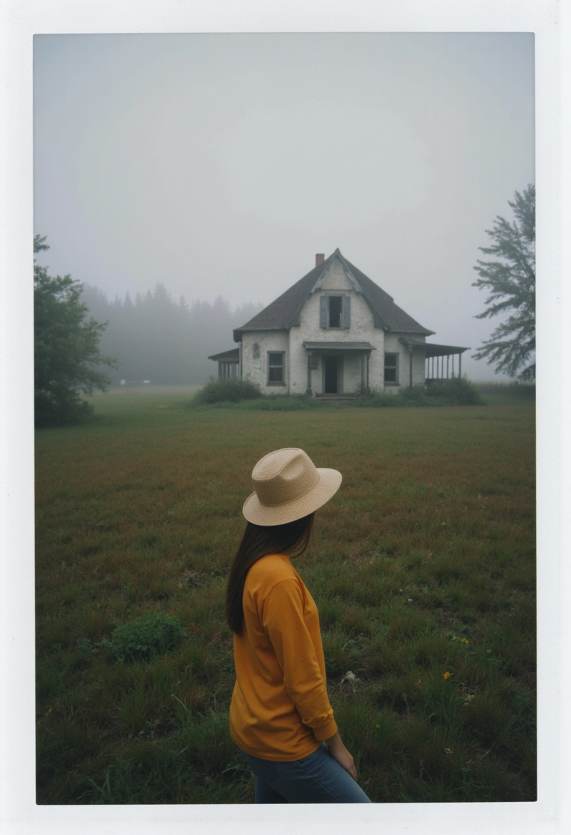 Фотография Полароида с белой рамкой — женщина в шляпе с широкими полями стоит у заброшенного дома, вокруг дикая природа и густой туман