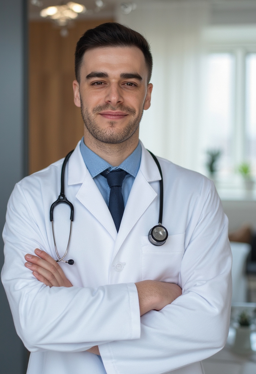 Молодой врач в белом халате стоит в современном светлом кабинете, стетоскоп на шее, улыбается и уверенно смотрит в камеру, на фоне медицинского оборудования.