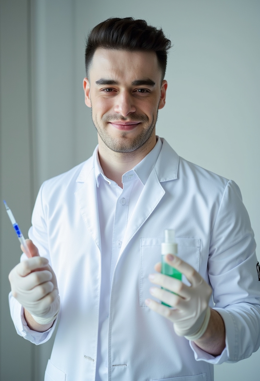 Косметолог в белом костюме с улыбкой держит пипетку и флакон, стерильная атмосфера вокруг, смотрит прямо в камеру