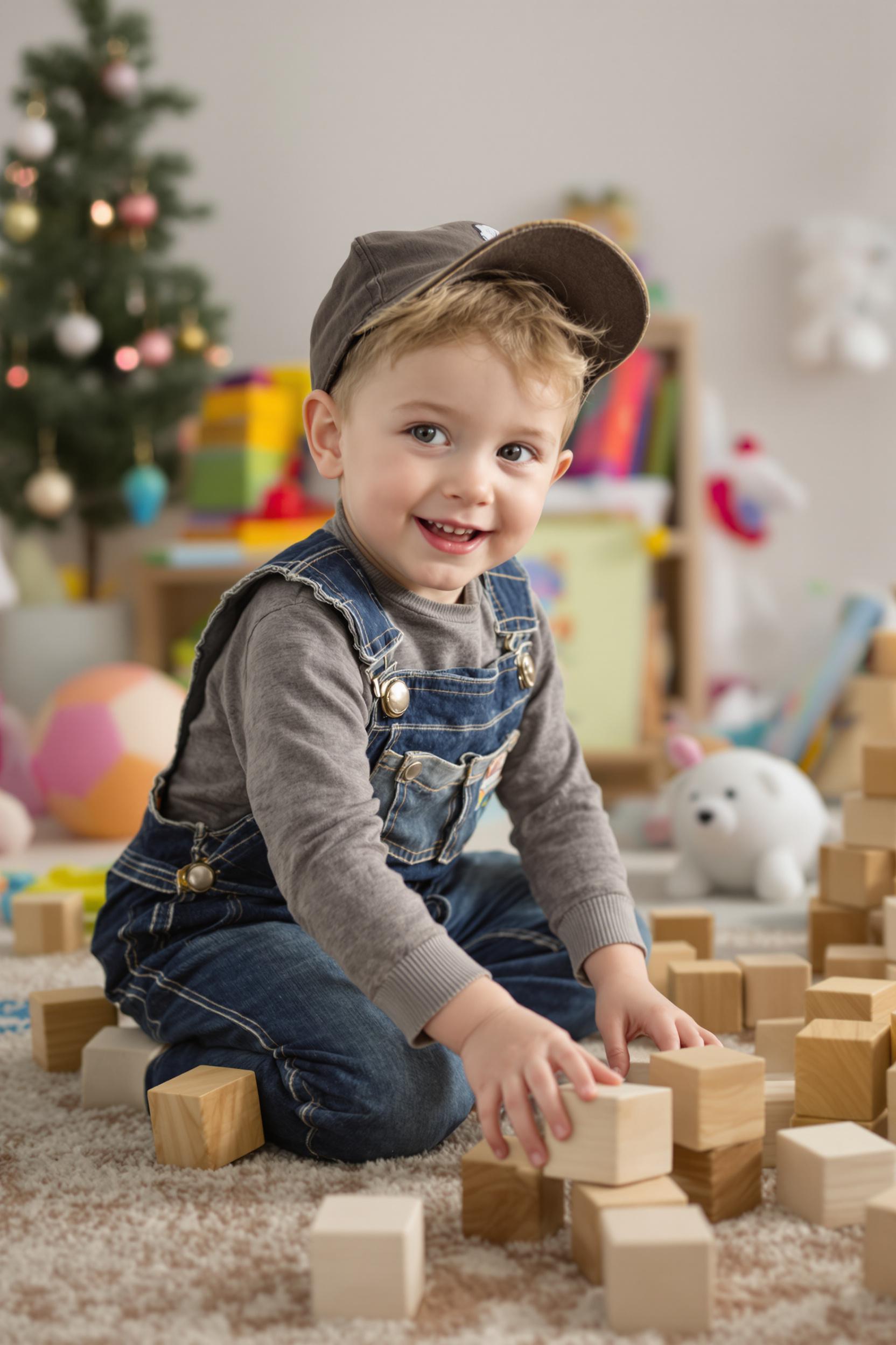 Мальчик в джинсовом комбинезоне и кепке играет с деревянными кубиками на ковре в уютной детской комнате. Он радостно смотрит в камеру, позади яркие игрушки и книжки. Крупный план.