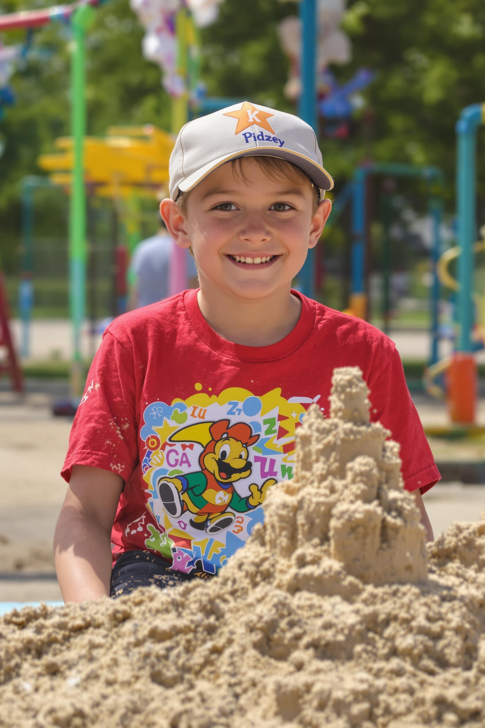 Мальчик в футболке и бейсболке стоит на детской площадке, гордо демонстрируя сделанный из песка замок. Он весело смотрит в камеру, на лице открытая улыбка. Крупный план, летняя атмосфера детства и счастья.