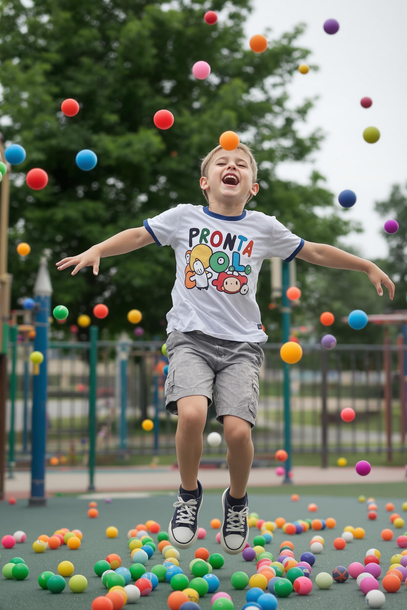 Мальчик в футболке и шортах играет с разноцветными мячами на площадке, подпрыгивая и громко смеясь. Крупный план, живые и искренние эмоции.