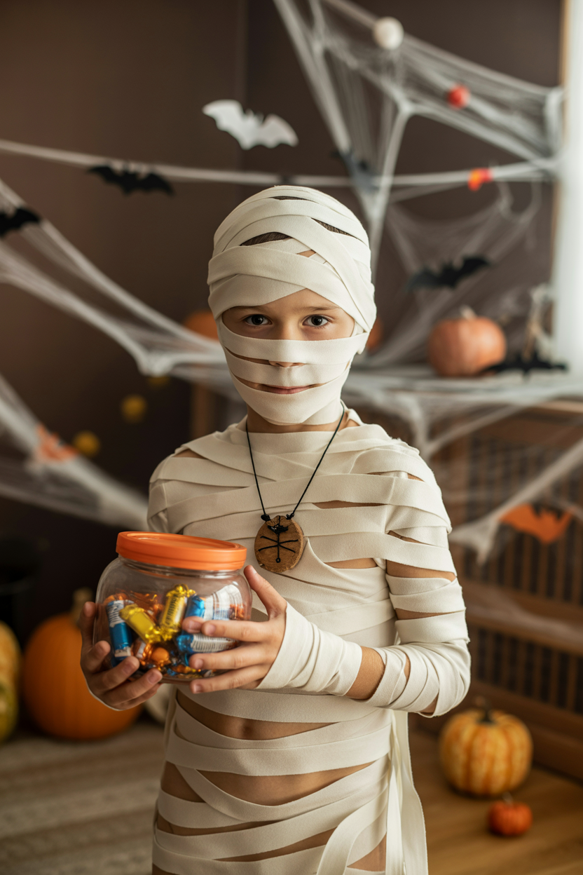 Мальчик в гостиной, украшенной бумажными летучими мышами и паутиной, одет в костюм мумии: обмотан белыми бинтами с прорезями для глаз и рта, сверху свободная туника цвета слоновой кости, на шее подвязан самодельный амулет, держит в руках пластиковую банку с конфетами, доверчиво смотрит в камеру, рядом разложены маленькие тыквы.