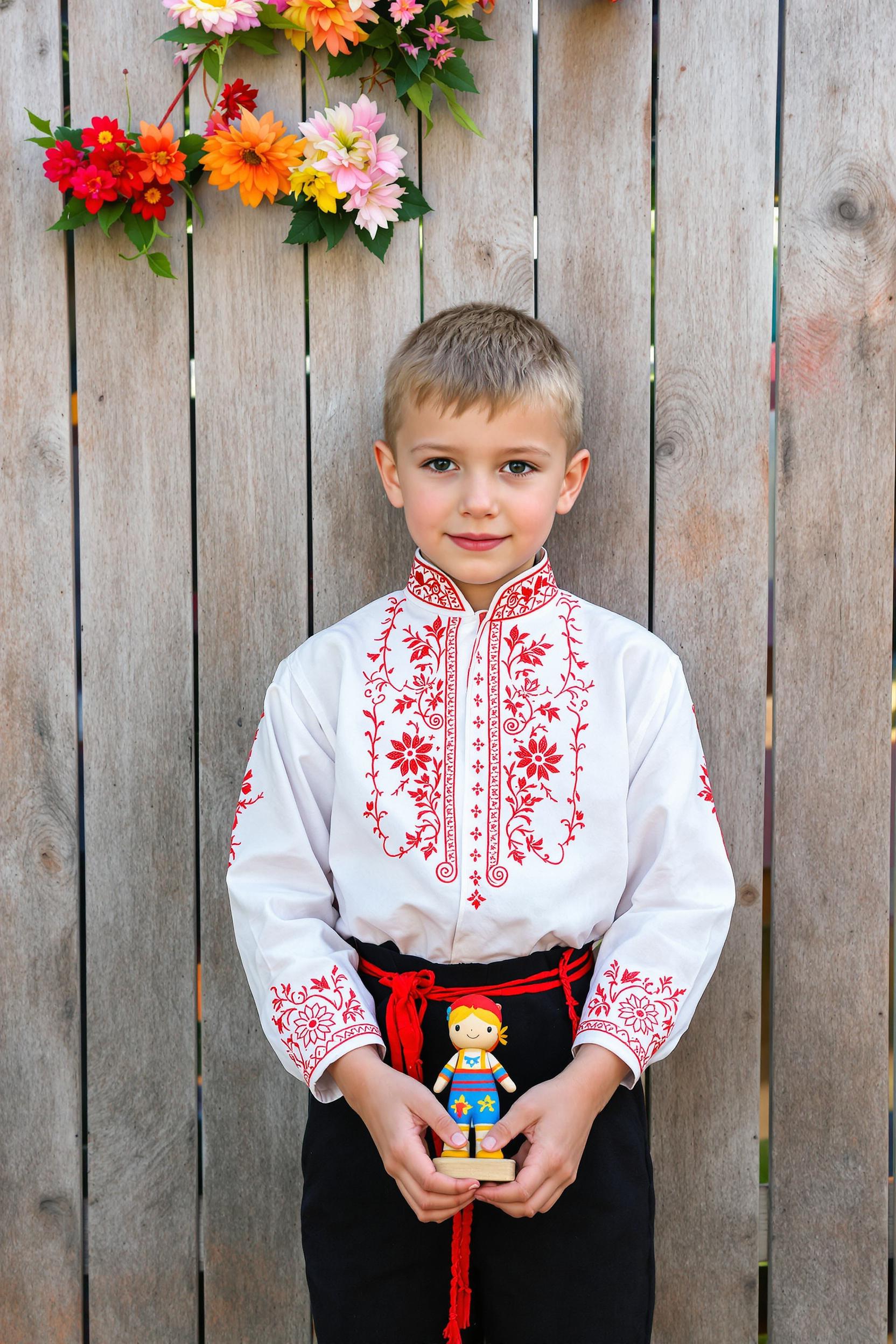 Мальчик в народной рубашке с красной вышивкой и тёмных штанах стоит на фоне деревянного забора, украшенного цветами. Он держит в руках расписную деревянную игрушку и уверенно смотрит прямо в камеру. Освещение мягкое, акцент на лице и костюме.