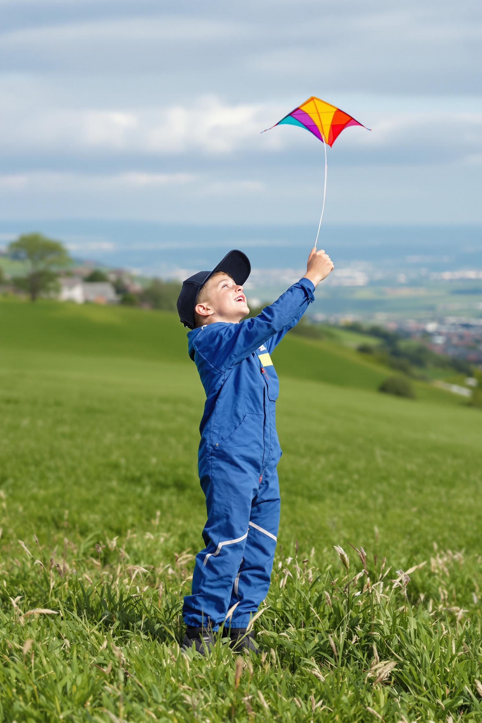 Мальчик в синем комбинезоне и кепке запускает воздушного змея на зелёном холме, его лицо сияет от восторга. Крупный план, энергия и радость детства.