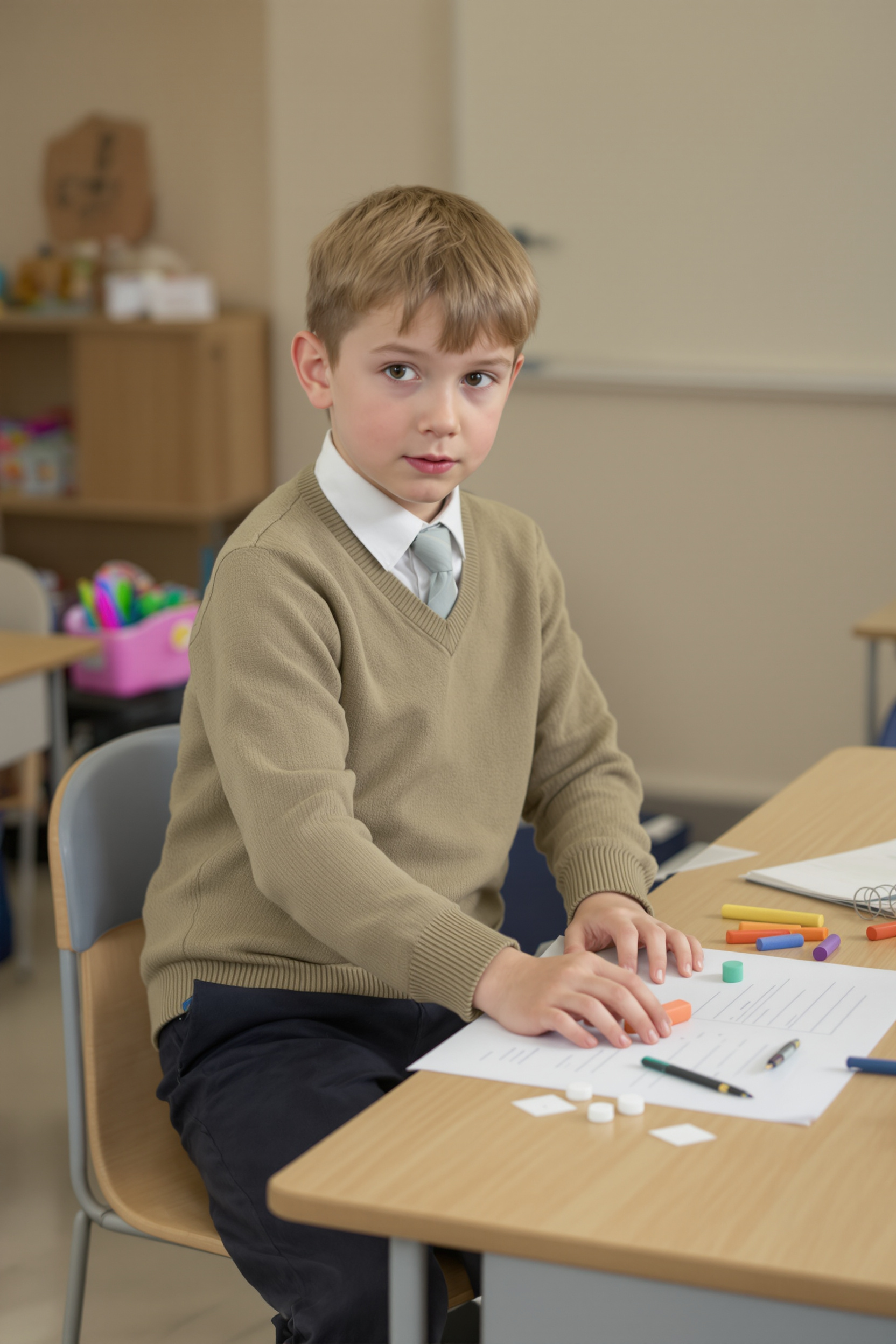 Мальчик в светло-оливковом джемпере и тёмно-синих брюках аккуратно расставляет ластики на парте, смотрит прямо в камеру, вокруг минималистичная школьная аудитория, на столе только школьные принадлежности.