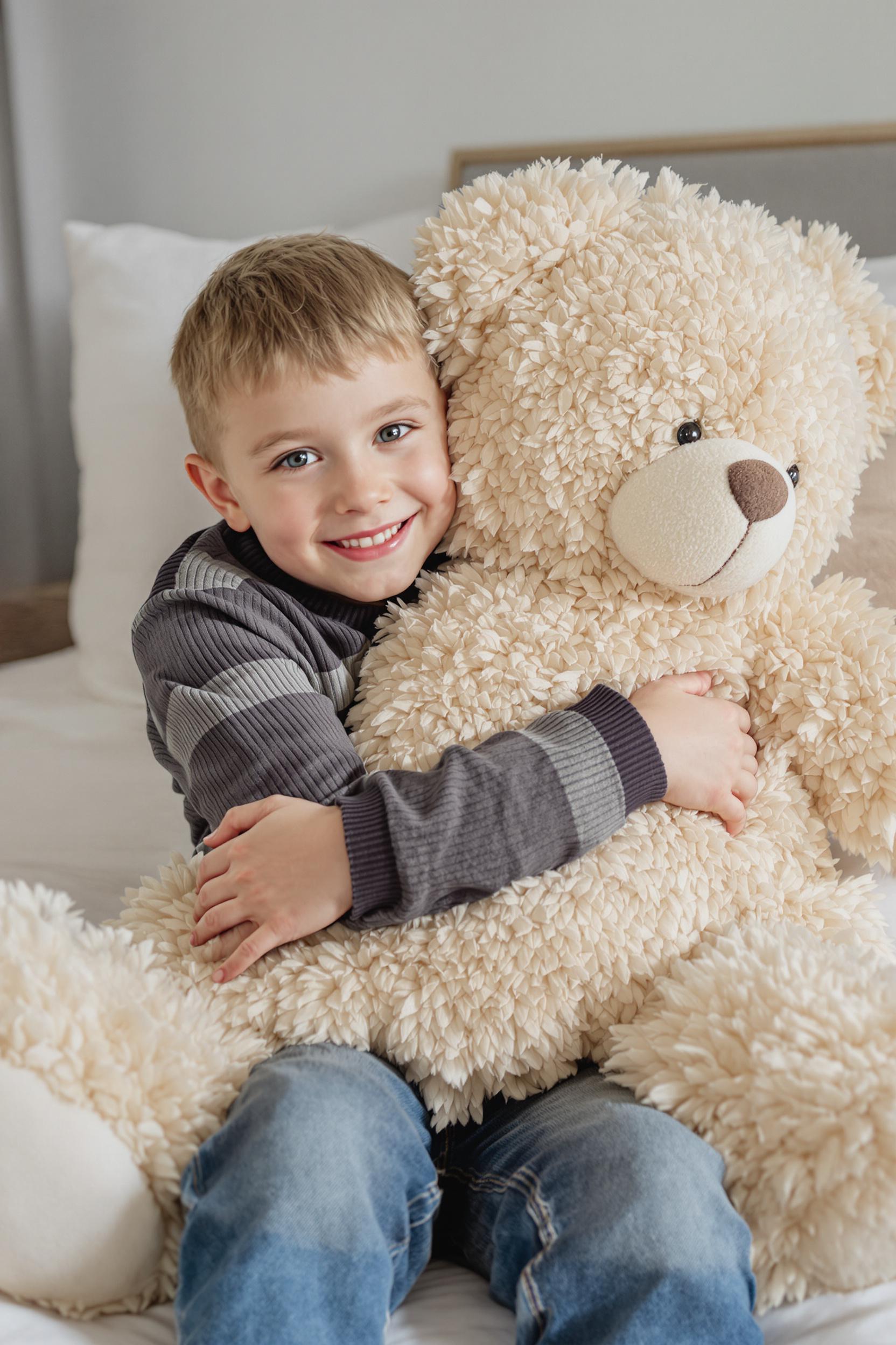 Мальчик в свитере и джинсах обнимает большую мягкую игрушку-медведя, сидя на кровати. Он смотрит прямо в объектив с широкой улыбкой. Крупный план, уют и тепло.