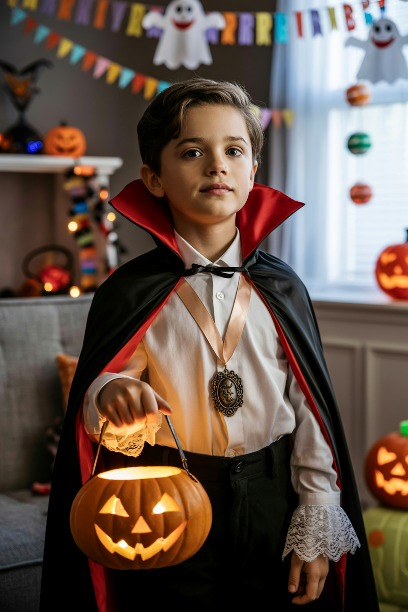 Мальчик в украшенной гирляндами и бумажными призраками гостиной, одет в костюм Дракулы: черно-красный плащ с высоким воротником, белая рубашка с кружевной манжетой, искусственный медальон на ленте, держит в руках резной фонарь из тыквы, смотрит в камеру, позади разноцветные хэллоуинские украшения.