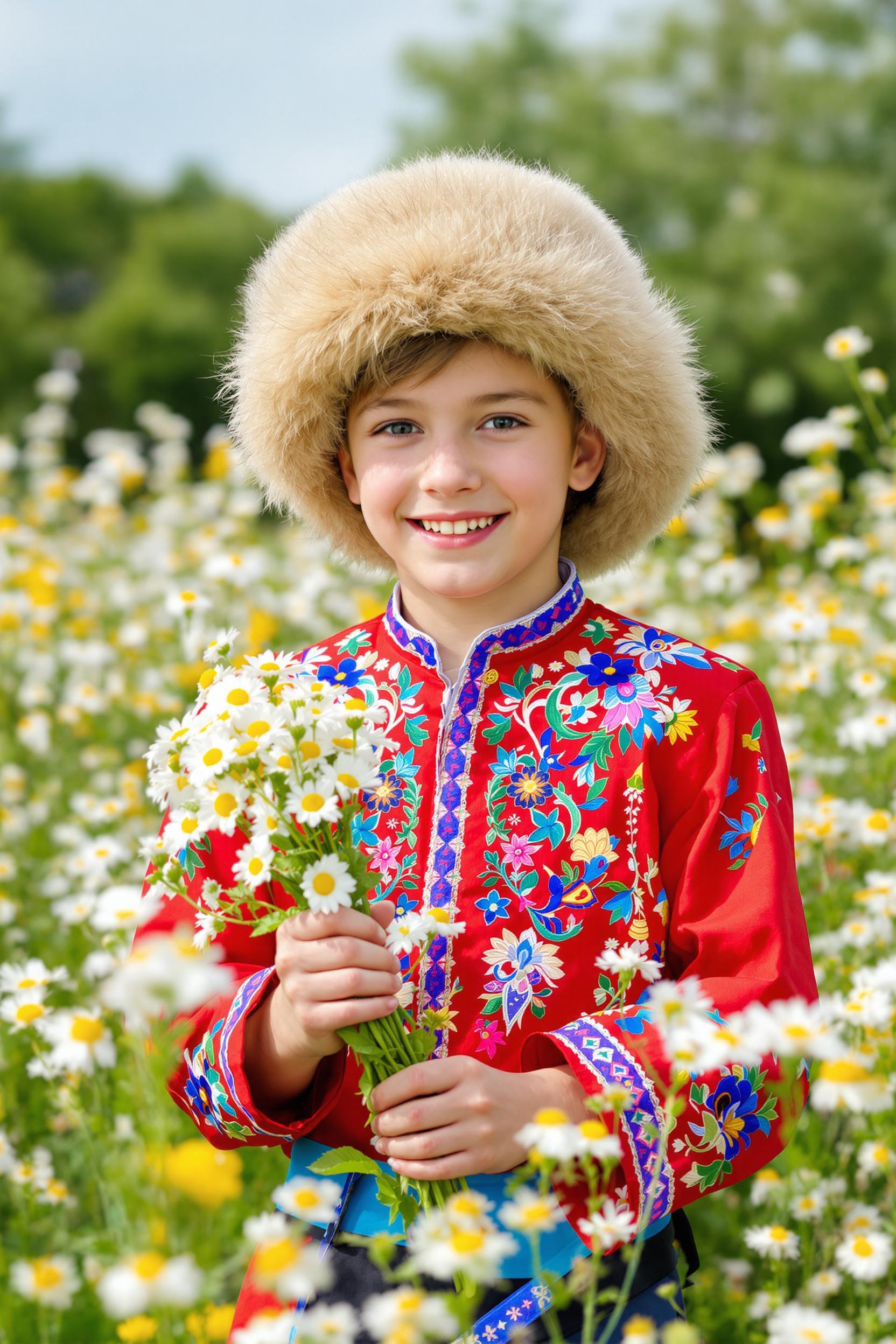 Маленький мальчик в яркой русской рубахе с цветной вышивкой и синим поясом позирует на фоне полевого цветочного луга. На голове у него пухлая шапка из овечьей шерсти. Он держит букет ромашек и с радостью смотрит прямо в камеру. Средний план, летний свет.