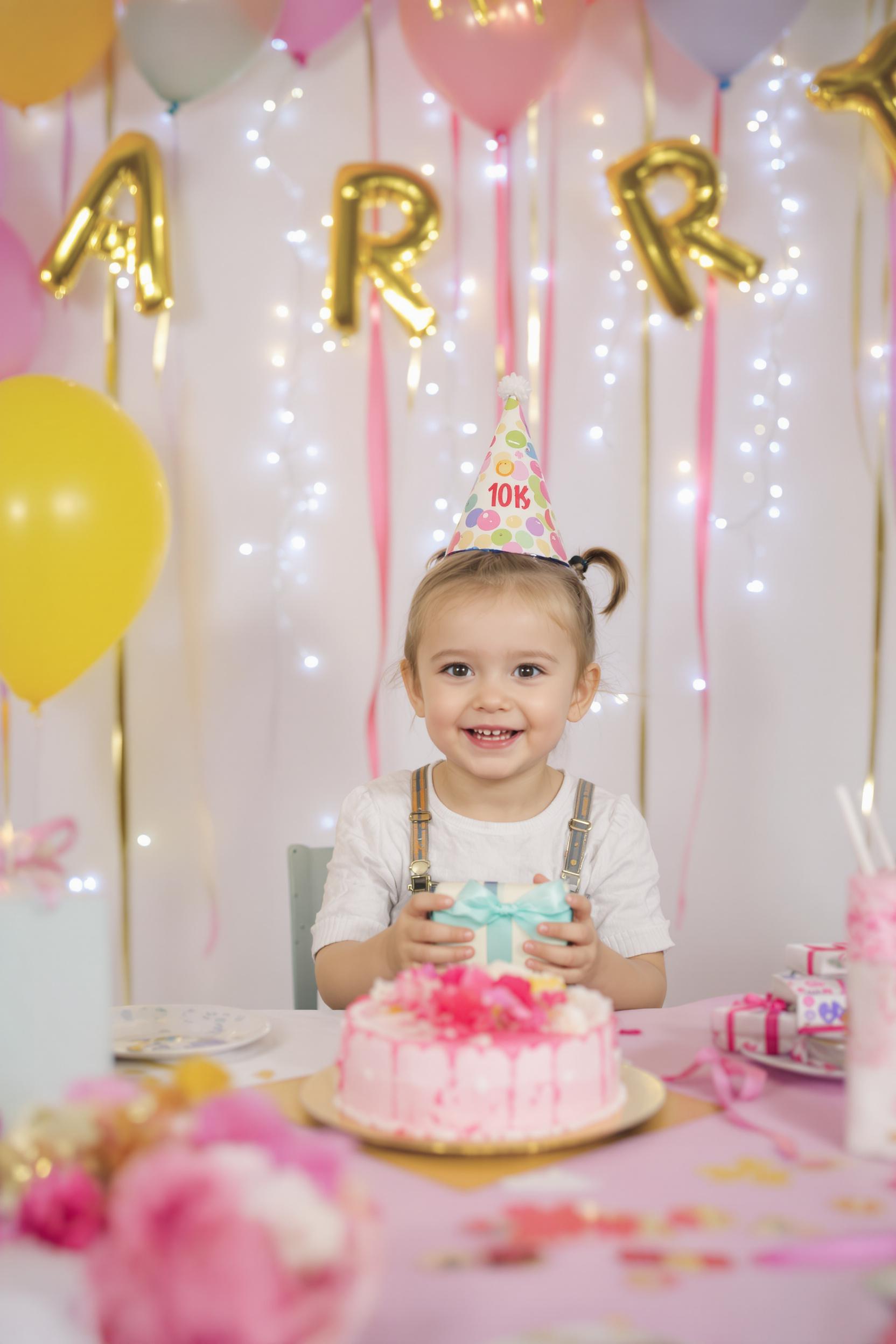 Маленький ребёнок с радостной улыбкой сидит за праздничным столом с тортом и яркими шарами, держит подарок, смотрит прямо в камеру, на фоне гирлянд и весёлого декора.