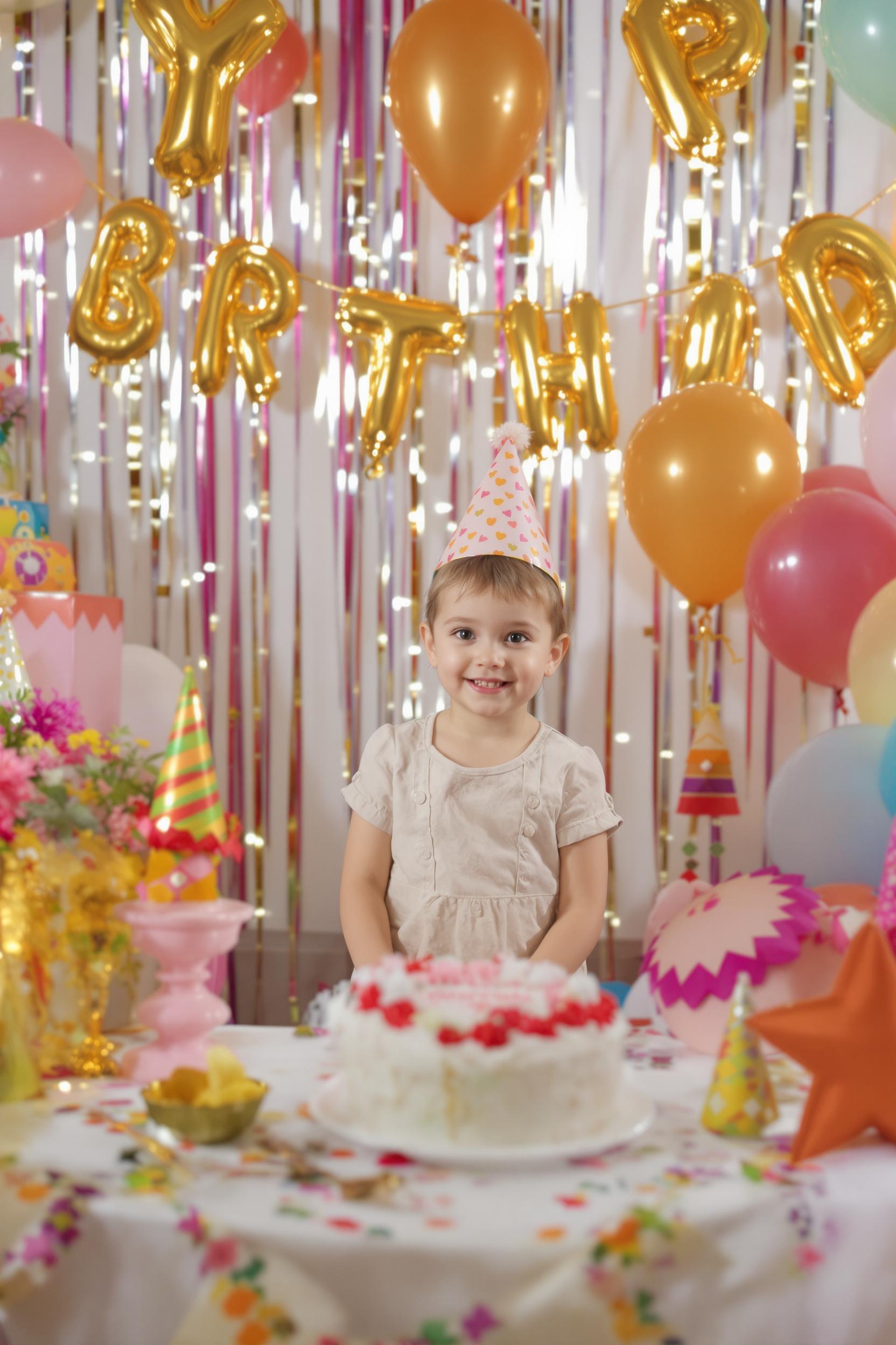 Маленький ребёнок стоит в комнате, украшенной воздушными шарами и гирляндами, праздничная шапочка, торт на столе, яркий свет, весёлая атмосфера, ребёнок улыбается в камеру.