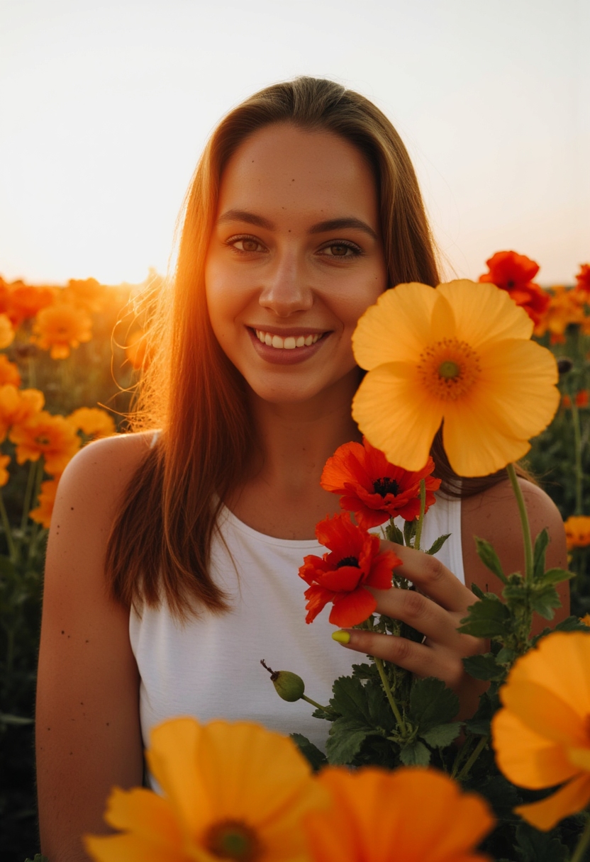 На залитом солнцем лугу, усеянном яркими цветами — маком, ромашками и васильками, позирует девушка с длинными светлыми волосами, заплетенными в неаккуратную косу. На ней лёгкое платье с цветочным узором, а в руках она держит охапку полевых цветов. Девушка смеётся и запускает цветы в воздух, улыбка...