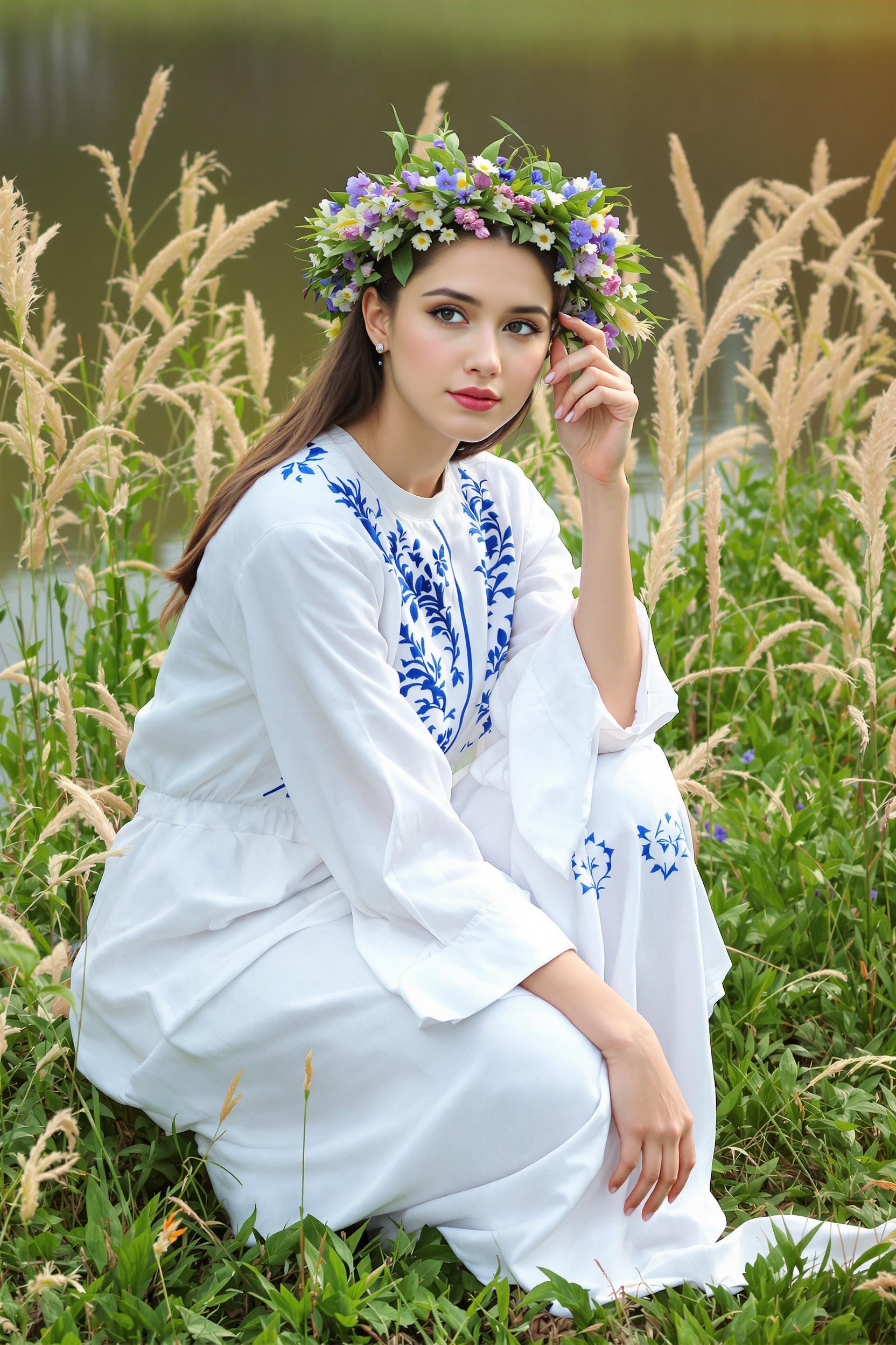 Девушка сидит на бревне у самого берега воды, на ней длинное белое хлопковое платье с широкими рукавами и тонкой вышивкой по вороту, по талии перевязан алой тесьмой. На голове пышный венок из разнотравья. Она смотрит в камеру, одной рукой опирается на бревно, вторая лежит на колене. Позади — высокий...