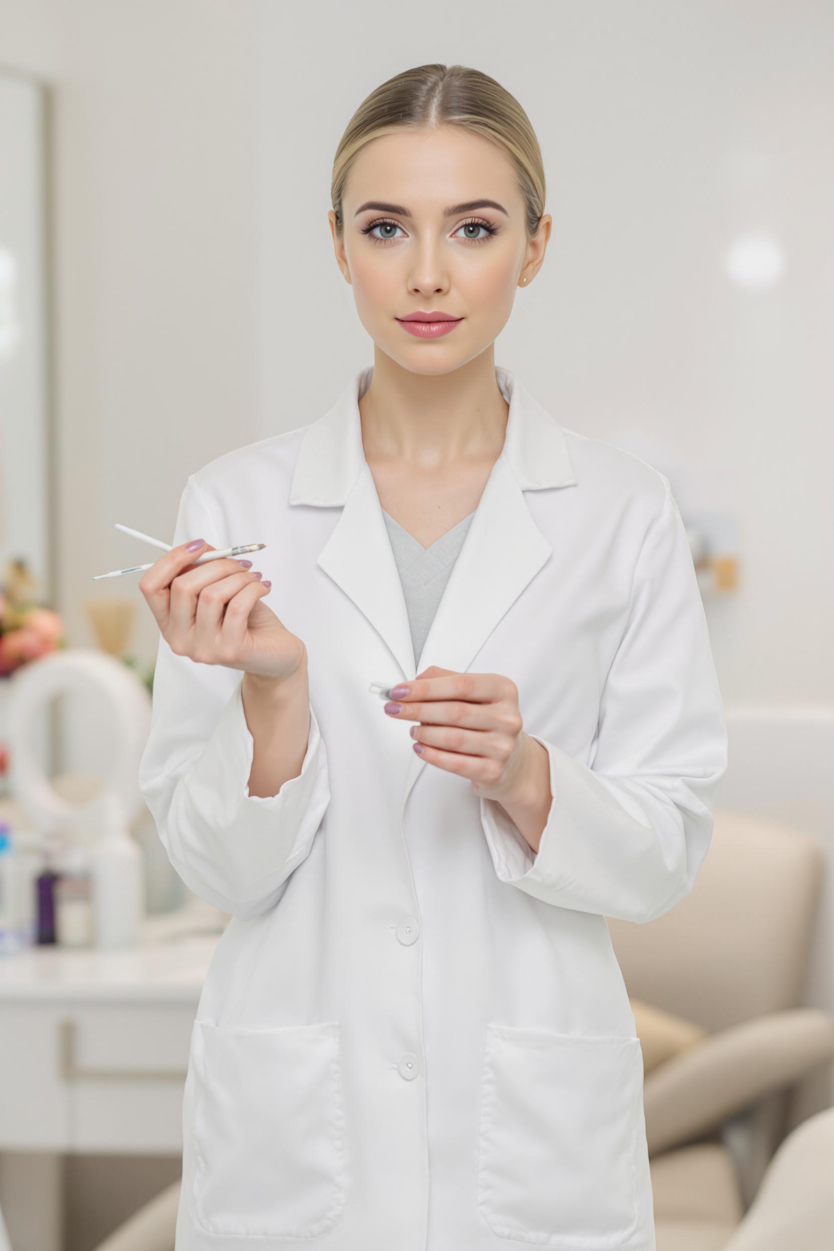 Молодая женщина-косметолог в белом халате стоит в современной светлой клинике, держит в руках инструменты для ухода за лицом, смотрит прямо в камеру, фон — минимализм, приятное освещение.