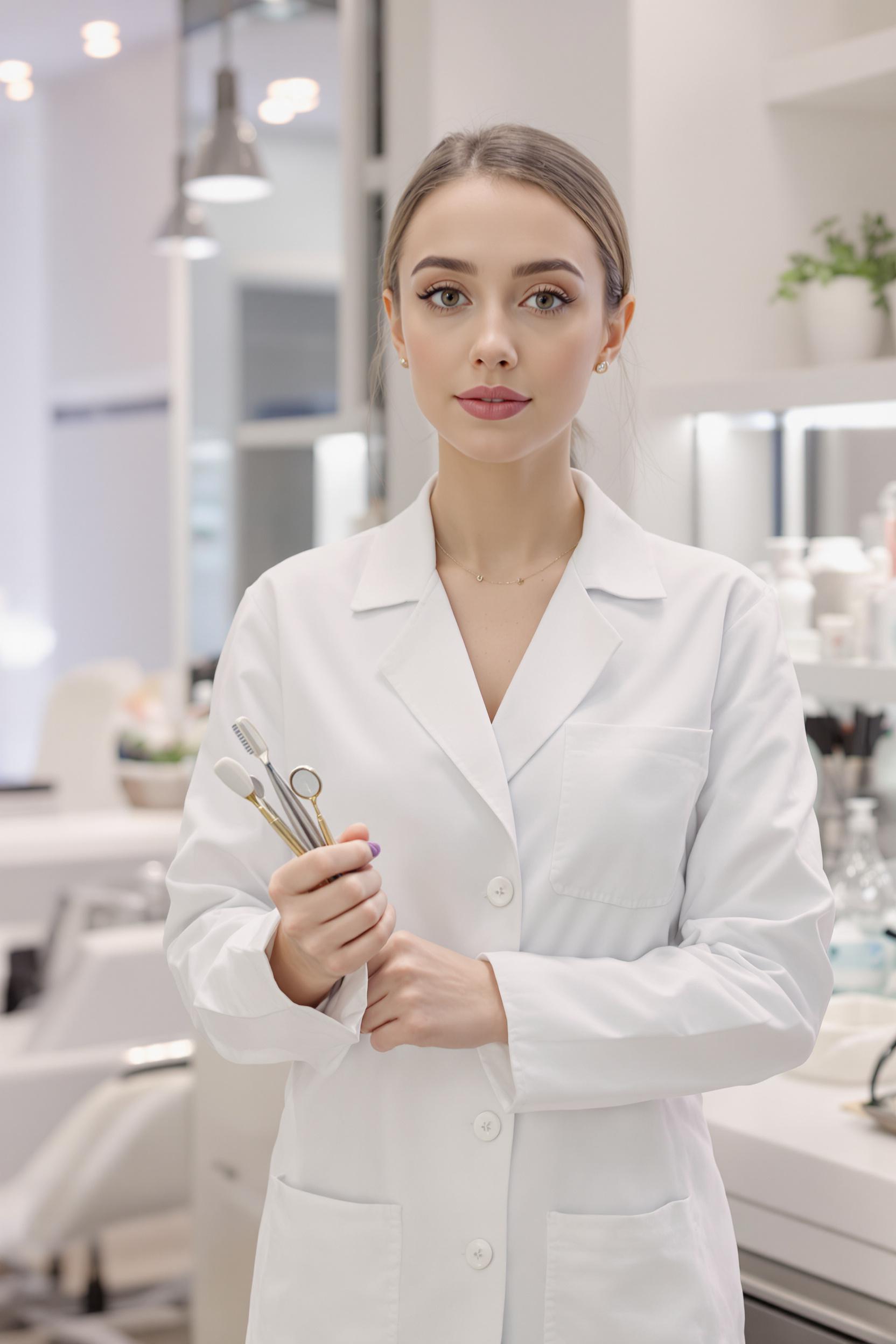 Косметолог в белом медицинском халате стоит на светлом фоне, держит инструменты для ухода за лицом, улыбается и смотрит в камеру, аккуратный макияж, профессиональный стиль, современный интерьер.