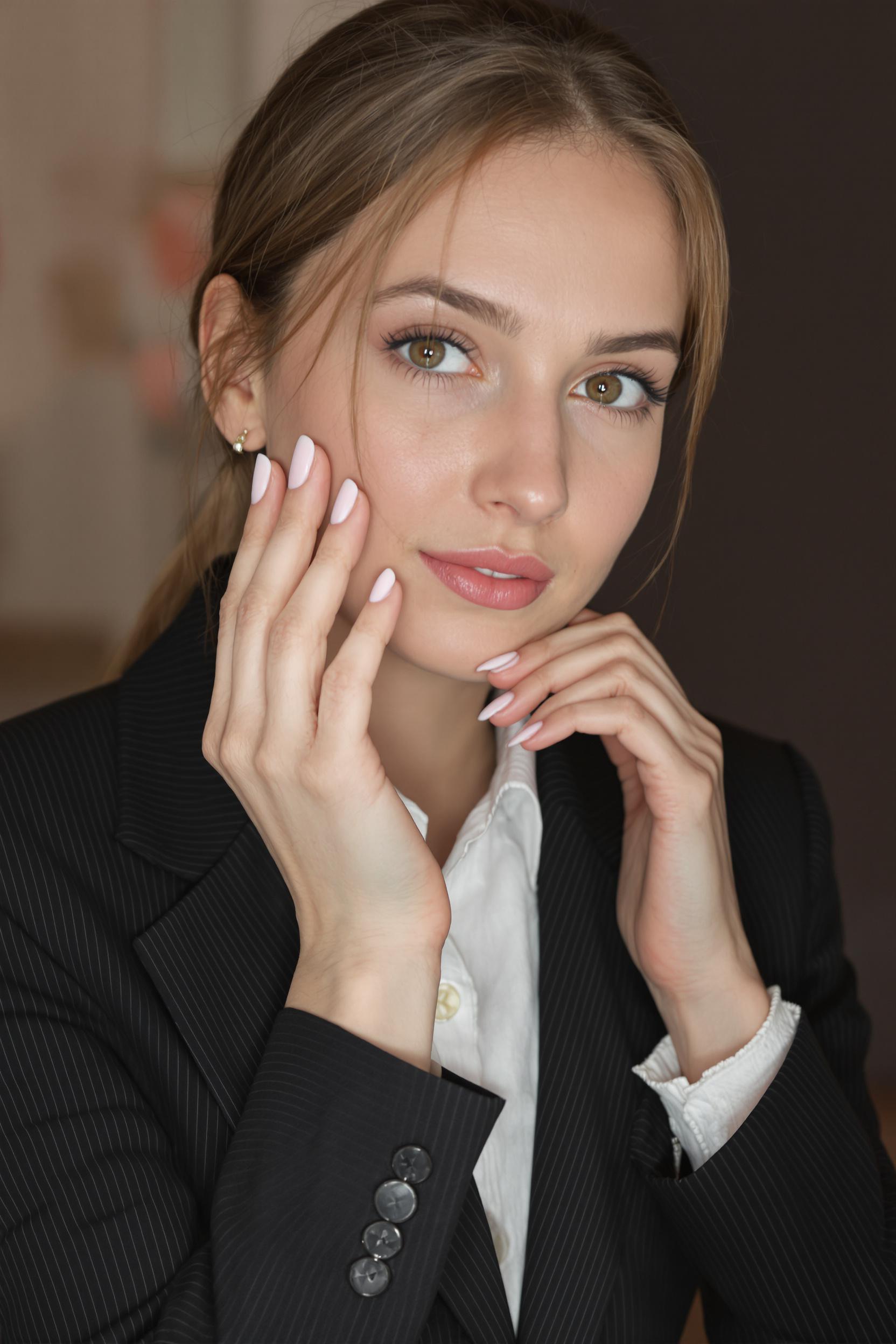 Молодая женщина-мастер маникюра в деловом костюме, средний план. Она смотрит прямо в камеру, кончики пальцев с лаконичным французским маникюром изящно прикасаются к щеке, лицо хорошо освещено, акцент на выразительных глазах и стильных ногтях.