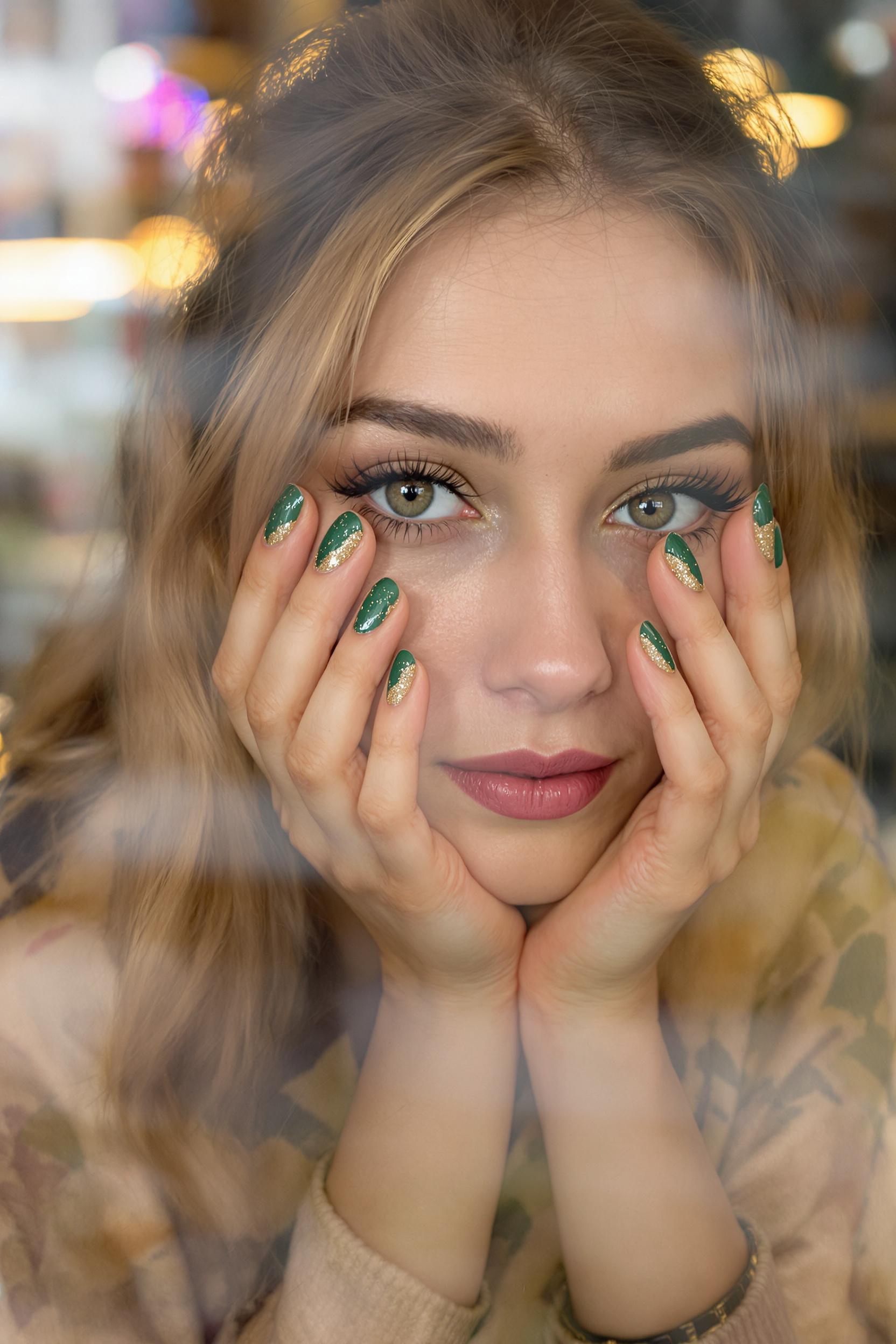 Молодая женщина-мастер маникюра в уютной кофейне, средний план. Она смотрит в камеру, лицо немного размыто, руки с глянцевым маникюром в тонах изумрудного и золотого элегантно обрамляют щеки, акцент на блестящем дизайне ногтей.