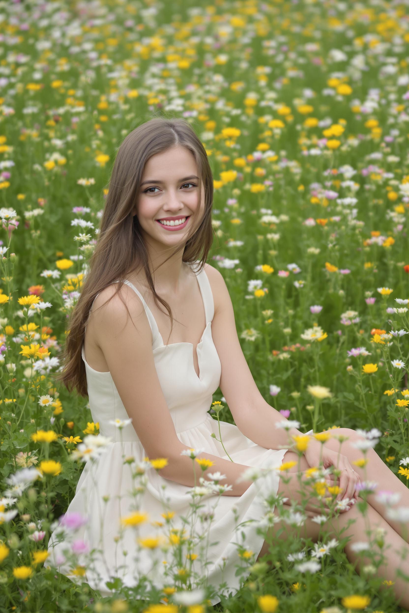 Молодая женщина сидит на поляне среди цветущих полевых цветов, одета в лёгкое кремовое платье, смотрит в камеру с расслабленной улыбкой, вокруг разноцветные бутоны и зелёная трава, лёгкий ветерок, минималистичный летний вайб.