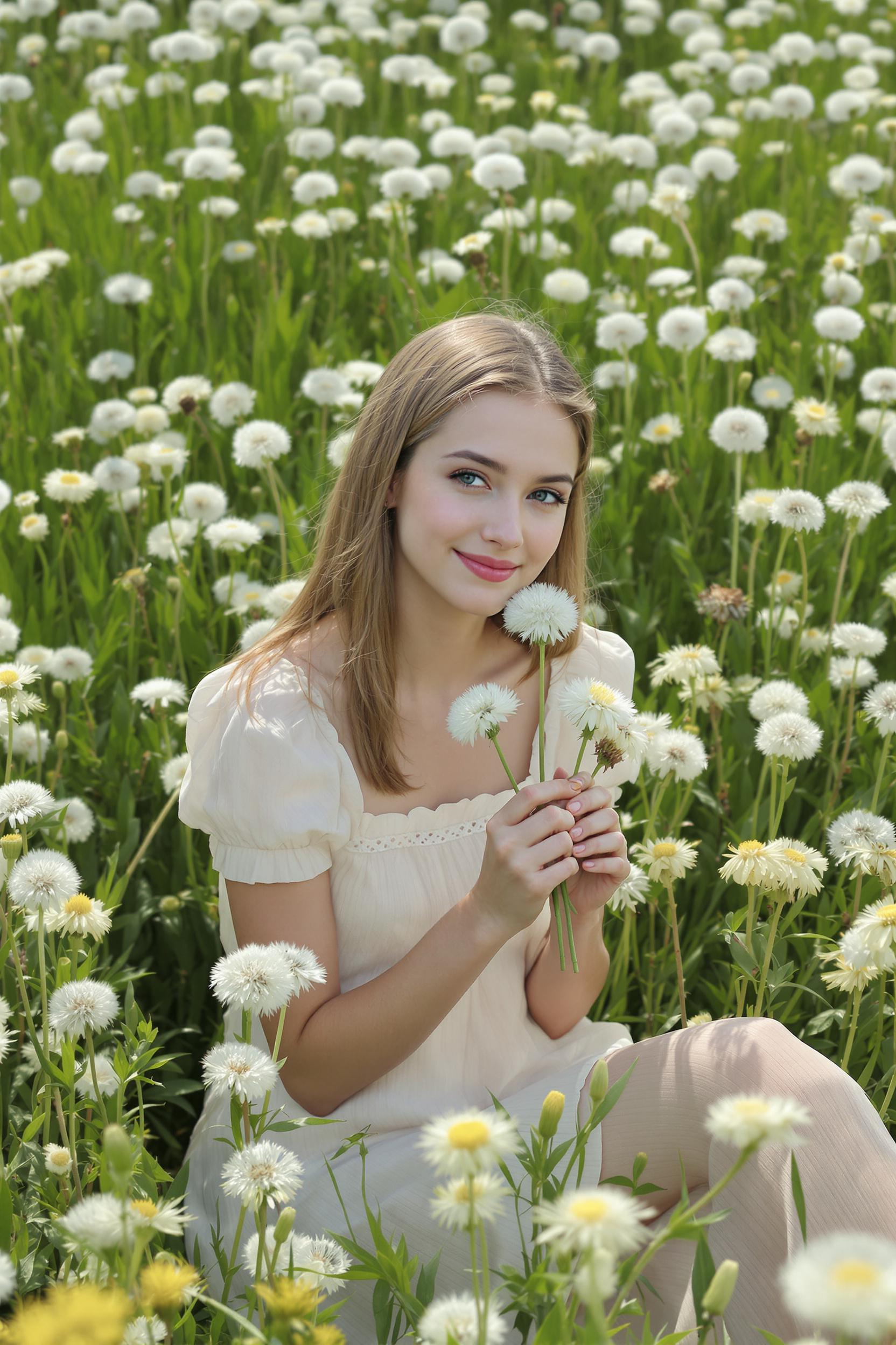 Молодая женщина сидит на солнечной поляне среди серых одуванчиков, одета в лёгкое светлое платье, держит несколько одуванчиков в руках, смотрит прямо в камеру с лёгкой, спокойной улыбкой. Вокруг зелёная трава, ощущение расслабленного летнего вайба и минимализма.