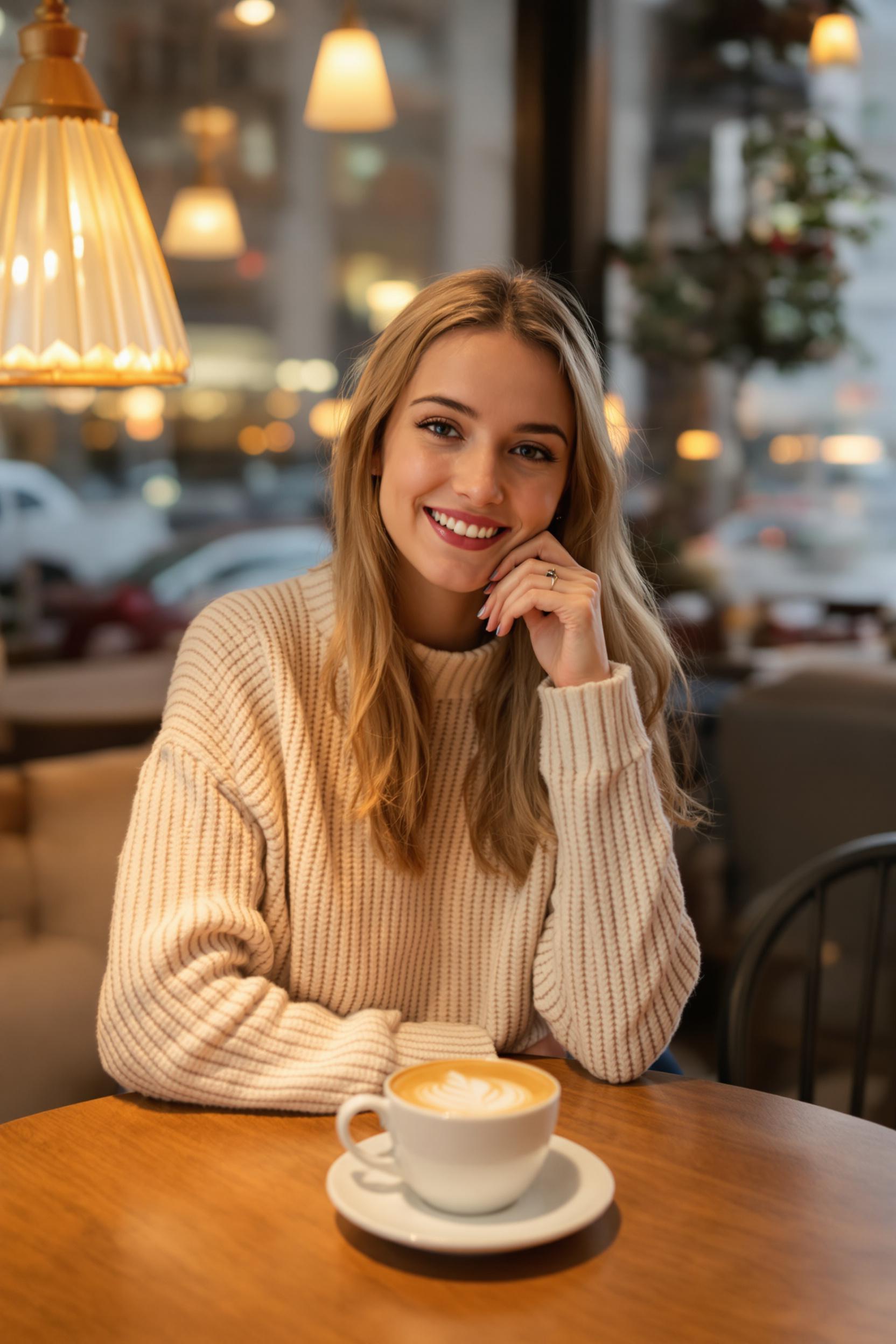 Молодая женщина сидит за деревянным столом в уютной кофейне, на ней светлый свитер и джинсы, перед ней чашка латте, теплый свет ламп, за окном видны размытые улицы города, она смотрит прямо в камеру и улыбается.