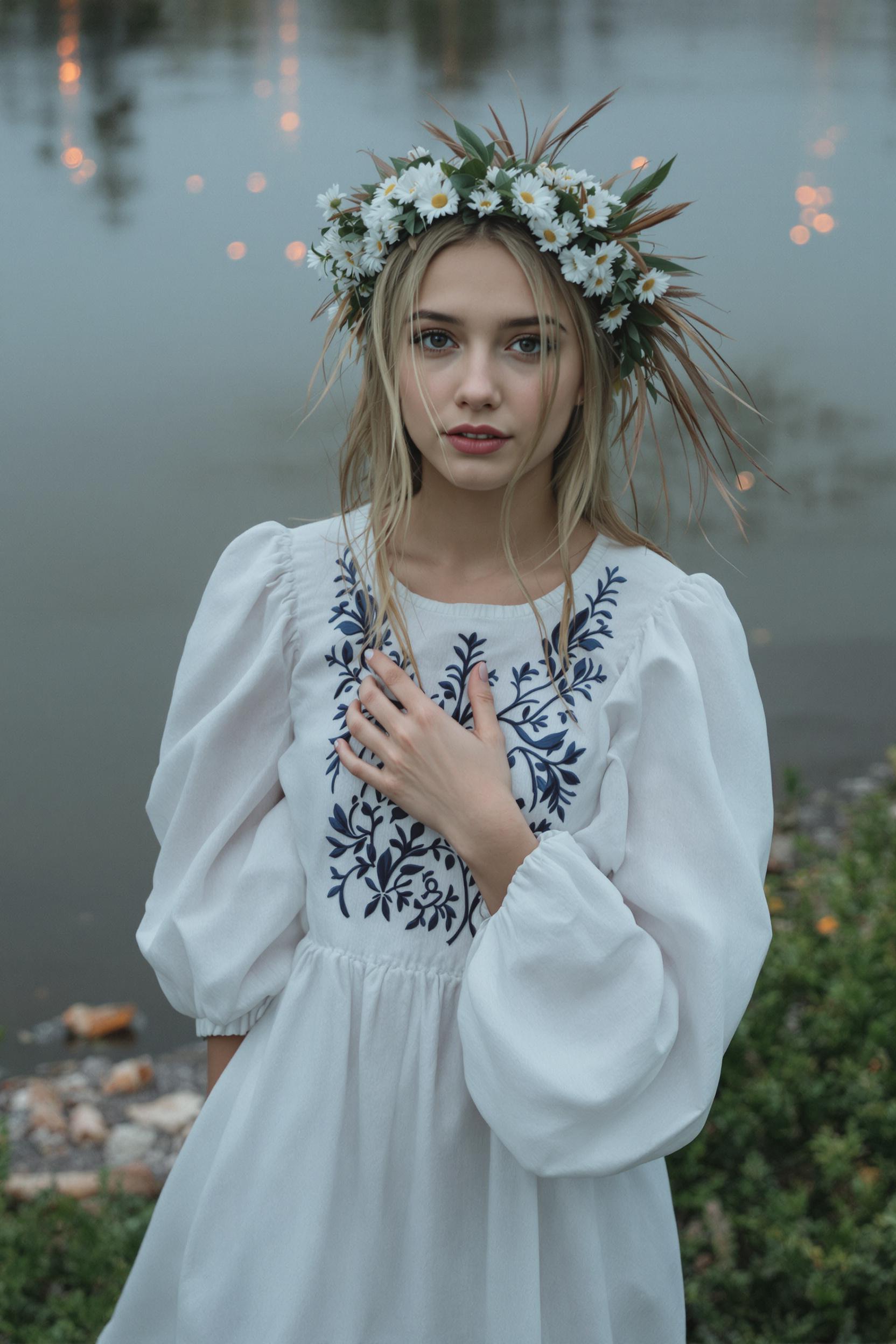 Примерить образ на себеМолодая женщина в белой хлопковой косоворотке с синей вышивкой по вороту и свободной длинной юбке стоит на сырой луговой траве у воды, венок из липы и ромашек обрамляет её волосы. Смотрит прямо в камеру, левая рука касается пояса, правая свободно опущена. Позади отражается пламя костра.