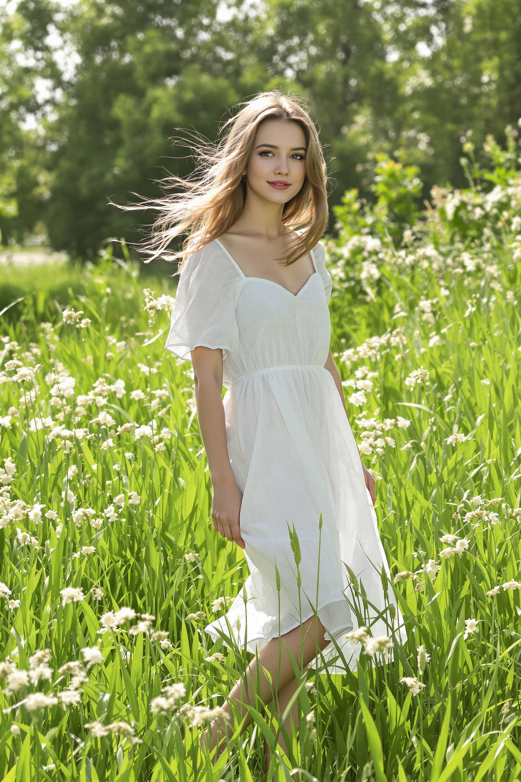 Молодая женщина стоит на залитой солнцем зеленой лужайке, одета в свободное белое платье, волосы развиваются на ветру, она смотрит прямо в камеру с легкой улыбкой. Вокруг свежая трава, атмосфера летней лёгкости и спокойствия, минимализм.