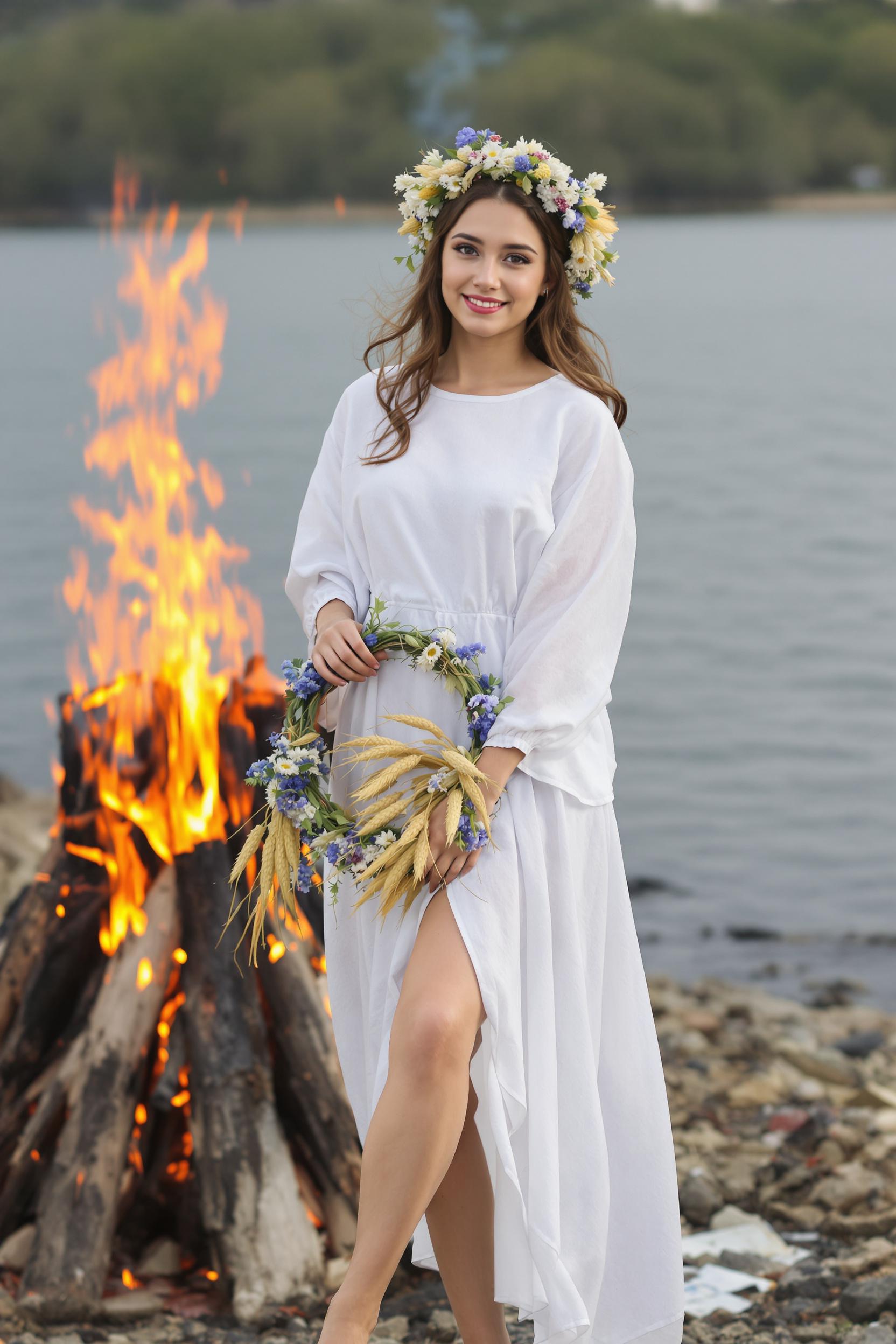 Девушка стоит у воды на фоне горящего костра в белой хлопковой рубахе с вышитым воротом и широкими рукавами, на талии атласный пояс, голова украшена венком из полевых цветов и злаков. Она смотрит прямо в камеру, руки сложены за спиной.