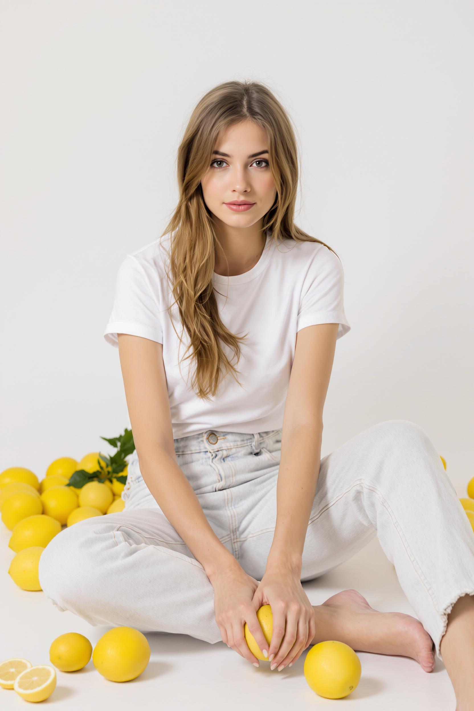 Молодая женщина в белой футболке и светлых джинсах сидит на светлом минималистичном фоне студии, вокруг неё ярко-жёлтые лимоны, некоторые лежат возле ног, некоторые в руках. Она смотрит прямо в камеру, расслабленная поза, атмосфера лёгкого летнего настроения.
