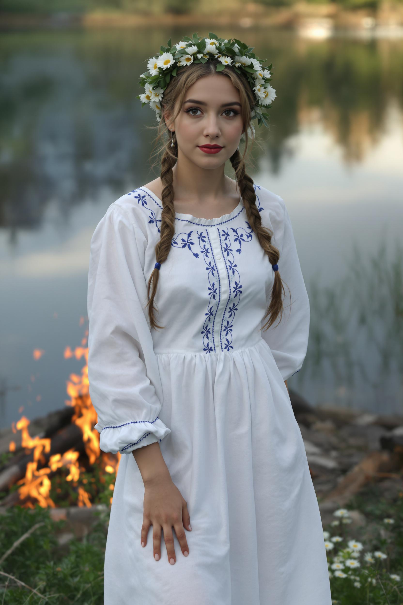 Молодая женщина стоит у реки на закате, позирует в белом хлопковом сарафане с вышивкой, на голове пышный венок из полевых цветов. За ней мерцает костёр. Она смотрит прямо в камеру, одна рука аккуратно держит подол платья.