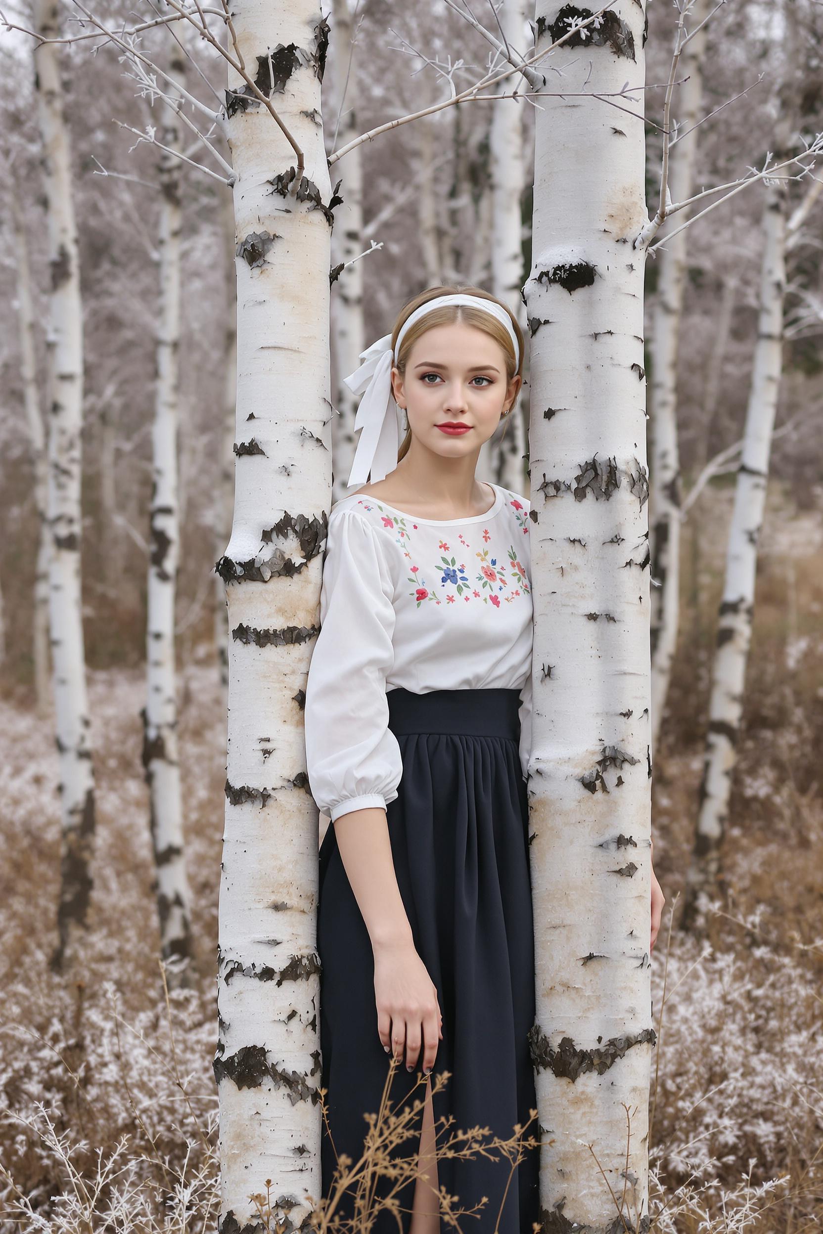 Молодая женщина в белой хлопковой рубахе с вышивкой, темный сарафан до пола, ленточная повязка в волосах, стоит среди берез, оперлась плечом о ствол, смотрит прямо в камеру, минимализм, легкий иней на ветках, ранняя зима.