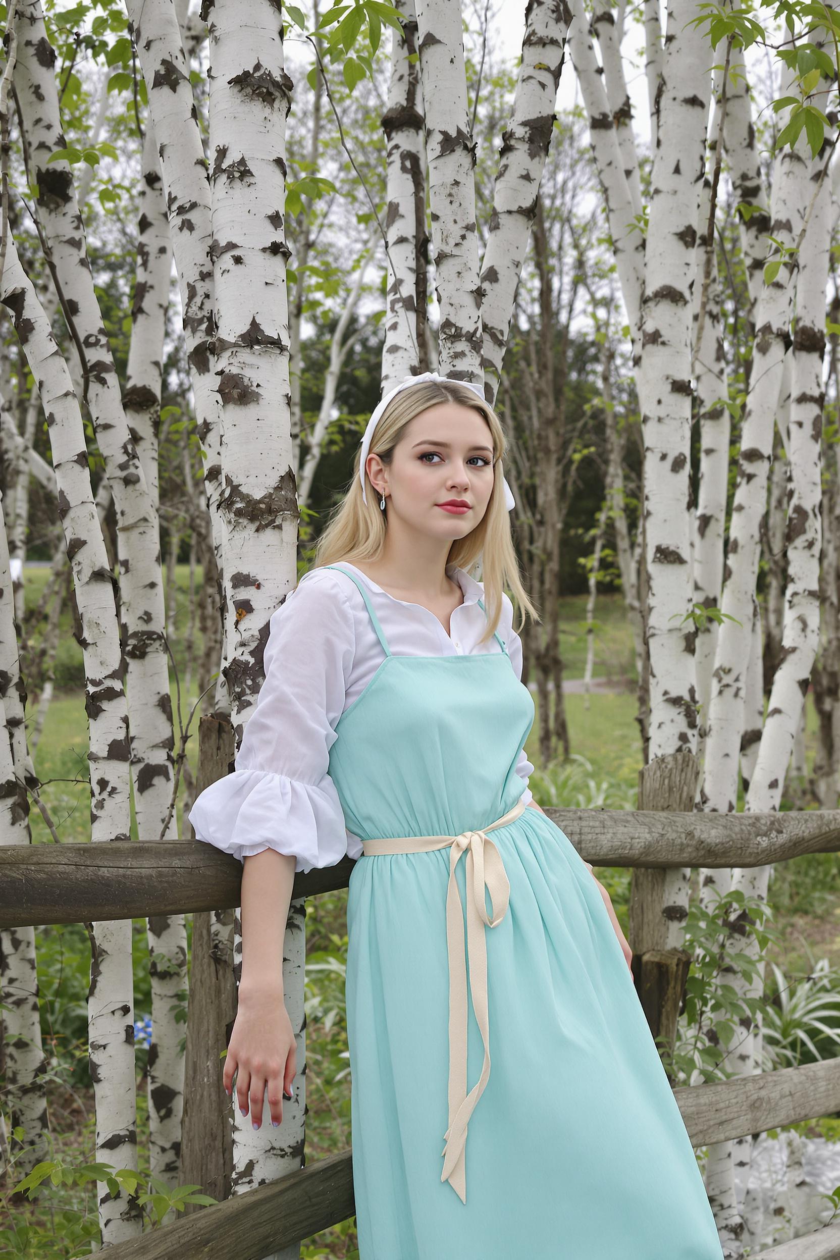 Молодая светловолосая женщина в длинном светло-бирюзовом сарафане с белой рубахой и тонким поясом, волосы собраны лентой, стоит возле берёз и деревянного забора, облокотившись на него локтем, смотрит прямо в камеру, минимализм, облачная погода, ранняя весна.