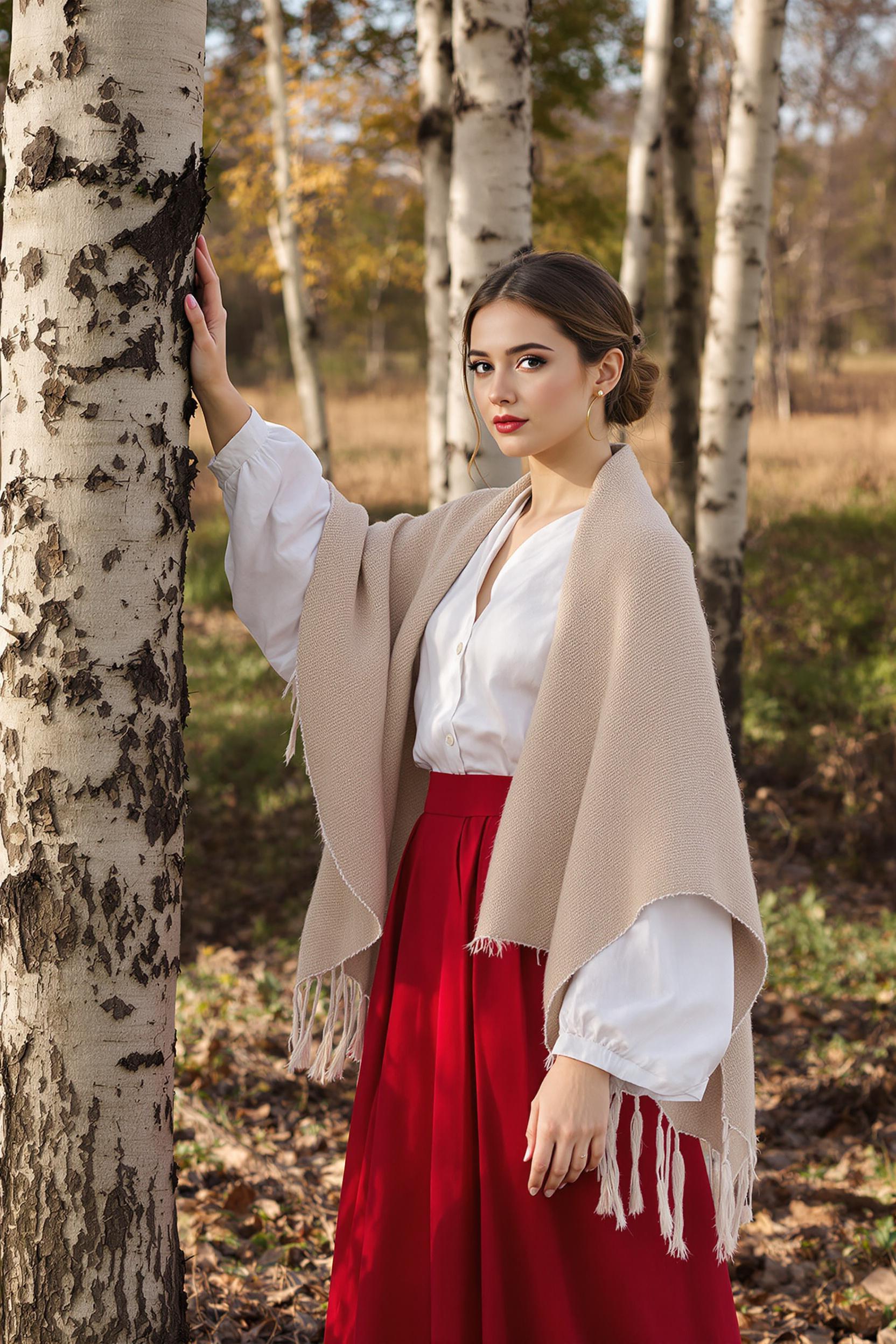 Молодая женщина в длинной красной юбке и белой льняной рубахе с широкими рукавами, на плечах шерстяной платок с кистями, волосы собраны в низкий пучок, стоит у березы, одной рукой касается ствола, смотрит в камеру, чистый минимализм, раннее утро.