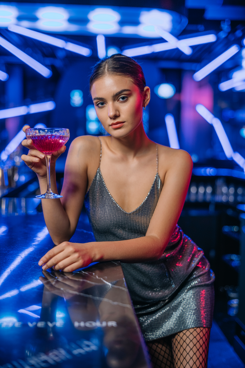 Молодая женщина в клубе, одета в блестящее серебристое мини-платье на тонких бретелях и черные лакированные ботильоны, стоит у стойки бара, держит в руке бокал с коктейлем и смотрит прямо в камеру. На заднем плане разноцветные световые пятна, атмосфера вечеринки, голубой неоновый свет подчеркивает праздничное настроение.