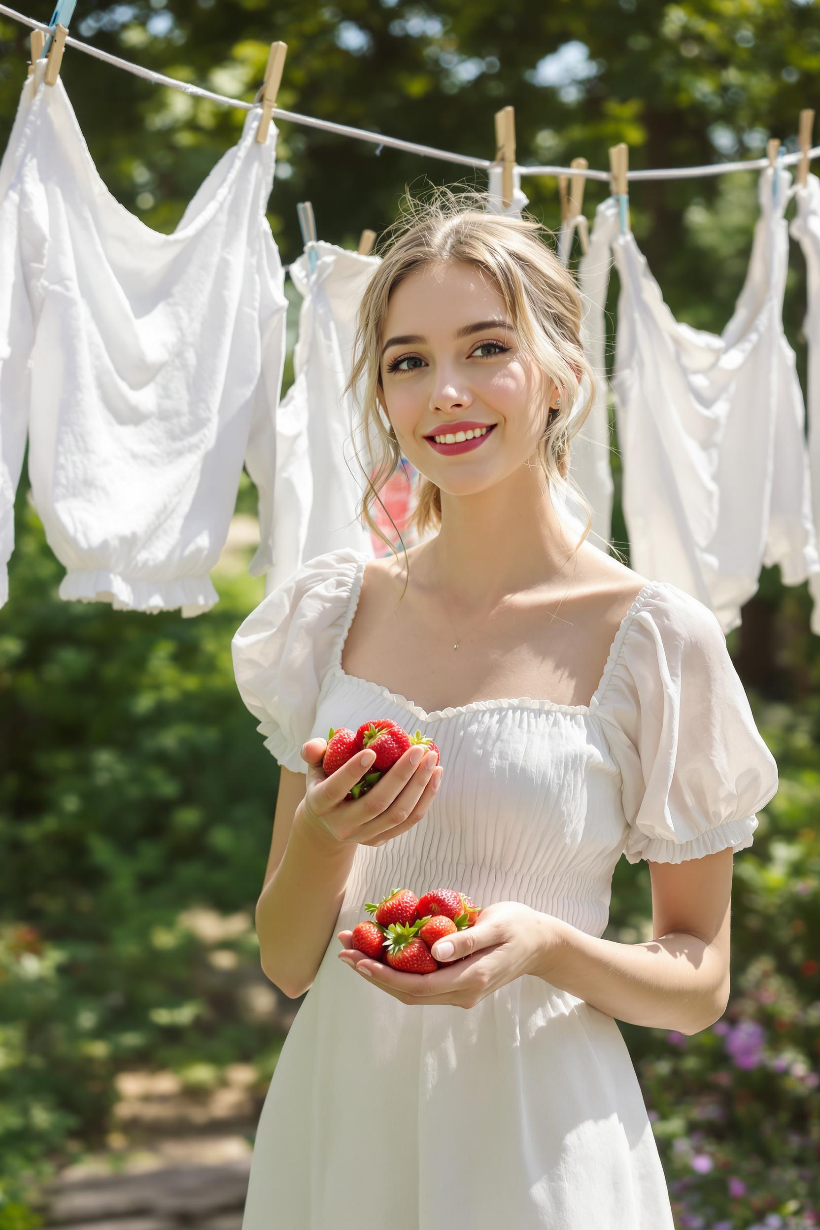 Молодая женщина в лёгком платье стоит среди развешенного на верёвке белого белья, повсюду чистота и мягкий солнечный свет. Она держит в руке свежую клубнику, смотрит прямо в камеру с лёгким выражением счастья, атмосферный летний минимализм.