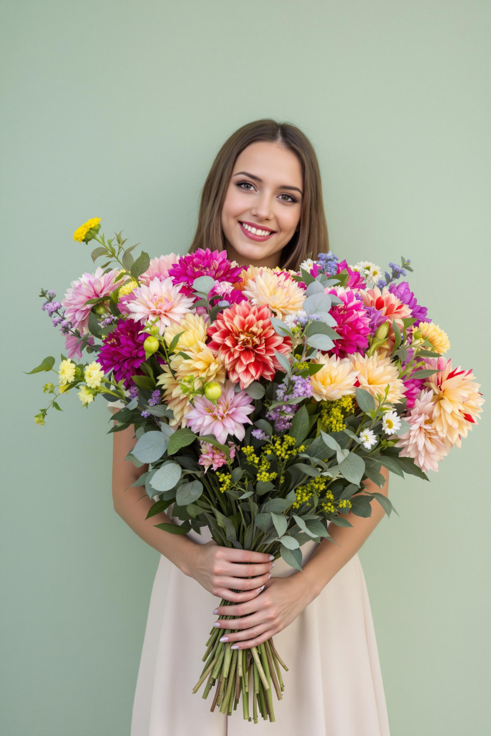 Молодая женщина в лёгком платье стоит у нежно-зелёной стены, перед ней огромный букет из разноцветных георгин и эвкалипта. Она смотрит прямо в камеру с тёплой улыбкой, обнимая цветы обеими руками, мягкий рассеянный свет подчёркивает свежесть образа.