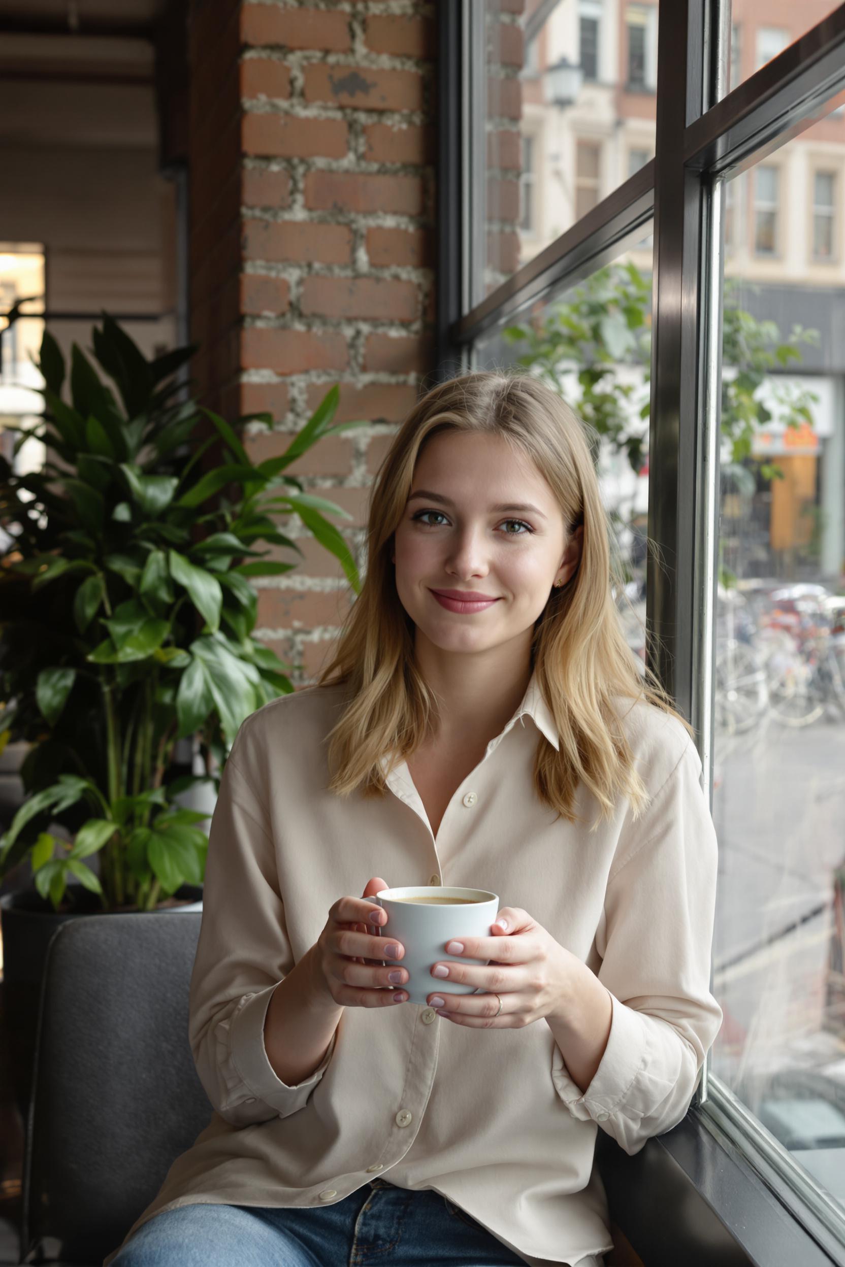 Молодая женщина в лёгкой бежевой рубашке сидит у большого окна современной кофейни, на фоне кирпичная стена и зелёные растения в горшках, она держит в руках чашку кофе с корицей, смотрит прямо в камеру с мягкой улыбкой, вокруг уютная атмосфера.