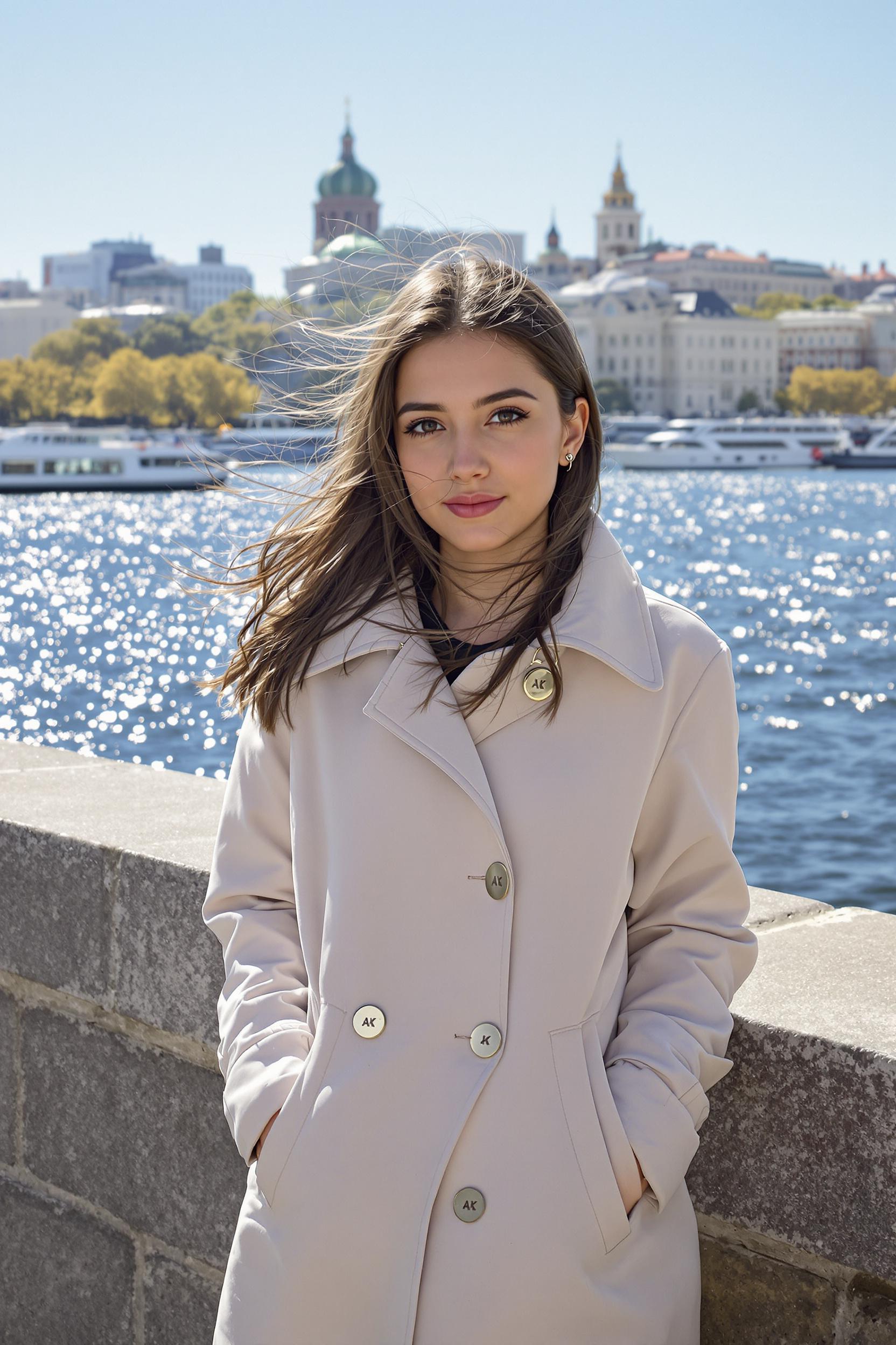 Молодая женщина в легкой ветровке стоит у каменного парапета набережной, волосы слегка развевает ветер, взгляд направлен прямо в камеру. На заднем плане — мерцающая поверхность реки, лодки и городские здания, ясный дневной свет, средний план.