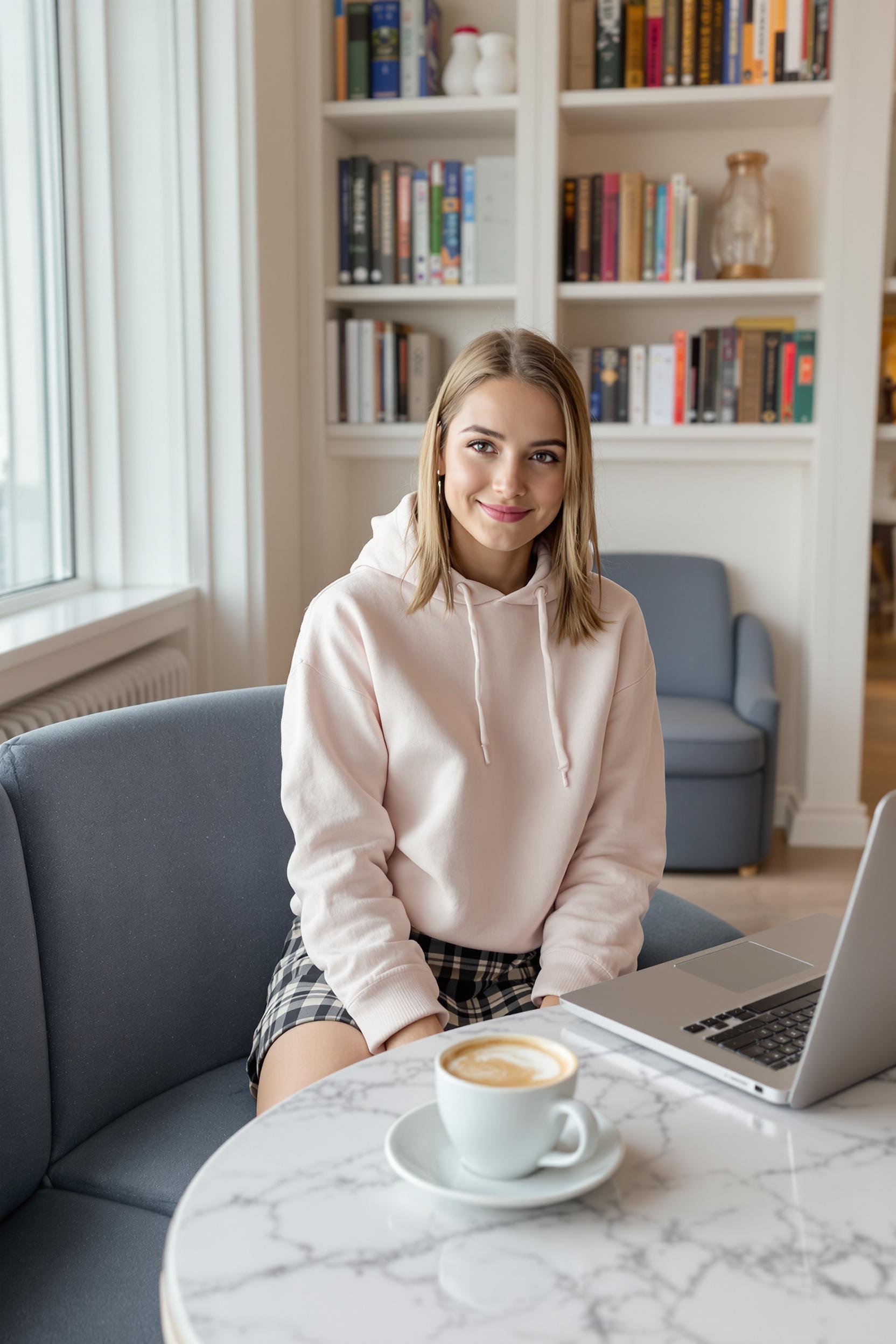 Молодая женщина в пастельной толстовке и клетчатой юбке сидит за мраморным столиком в современной кофейне с панорамными окнами. Перед ней чашка латте и ноутбук, на фоне книжные полки и светлые стены. Она смотрит прямо в камеру, лёгкая улыбка, уютная атмосфера.