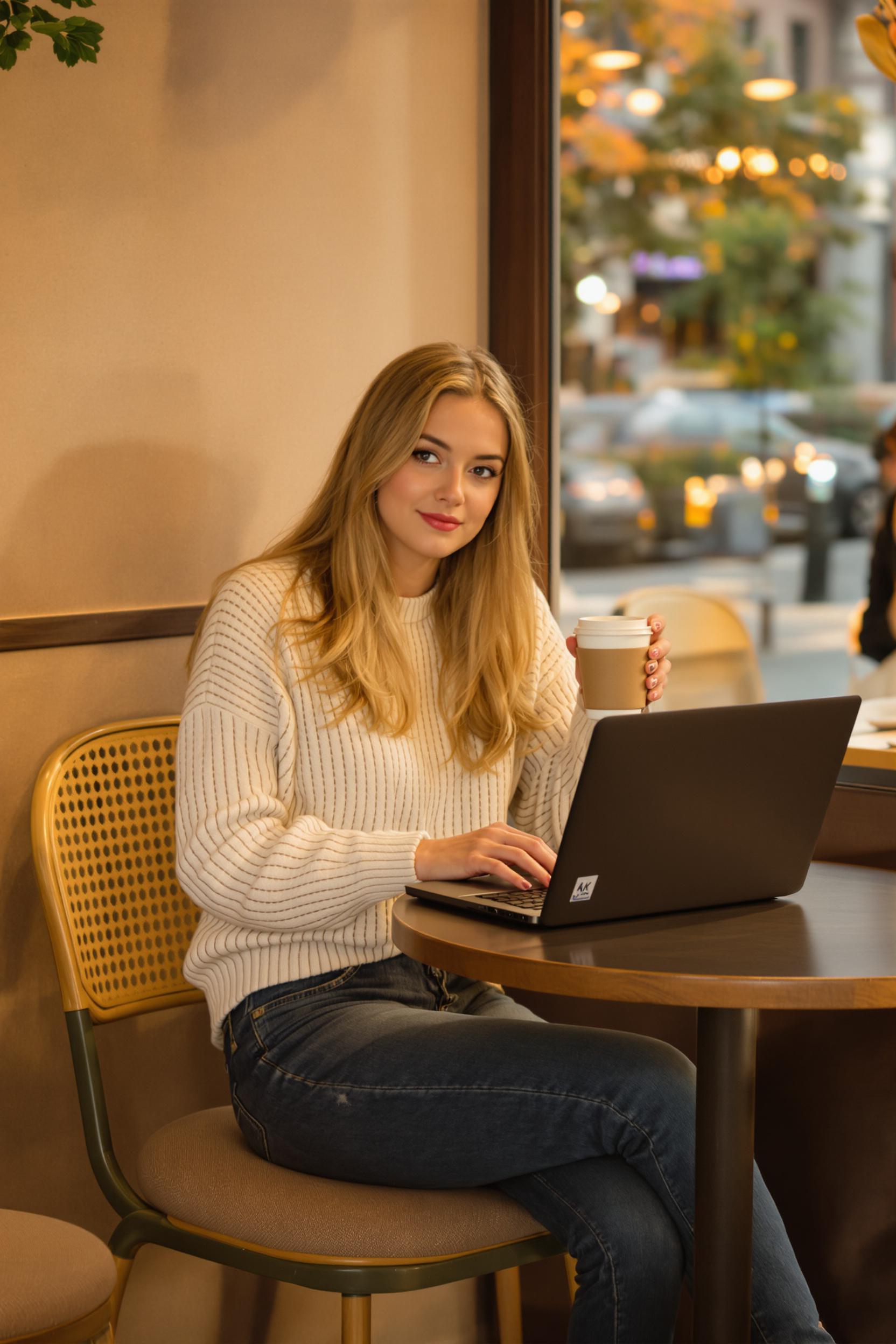 Молодая женщина в повседневной одежде — светлой кофте и джинсах — сидит за небольшим столиком в уютной городской кофейне. Перед ней раскрыт ноутбук и чашка кофе, она поддерживает взгляд камеры, вокруг мягкий золотистый свет, средний план.