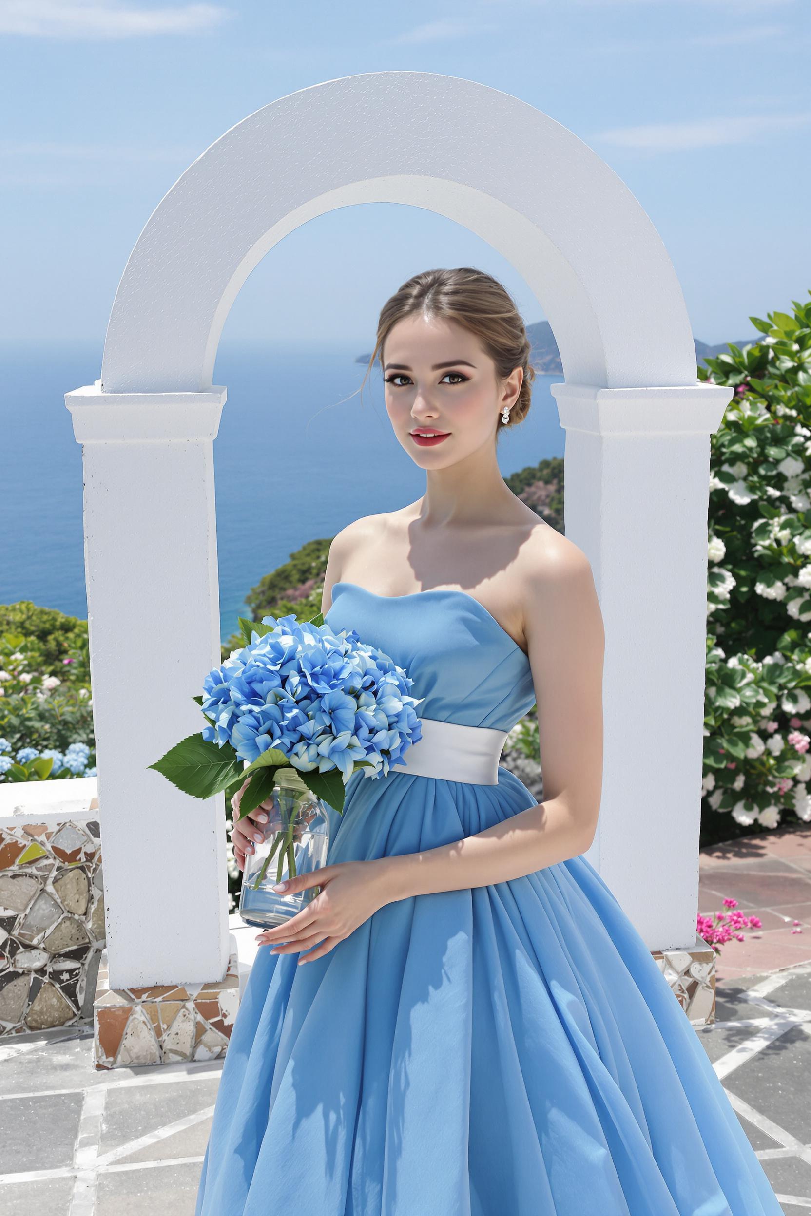 Молодая женщина в пышном голубом платье с белым поясом стоит средним планом у белой арки с видом на море, смотрит в камеру. Волосы собраны в низкий пучок, в руках она держит прозрачную стеклянную вазу с голубыми гортензиями, поза изящная и расслабленная.