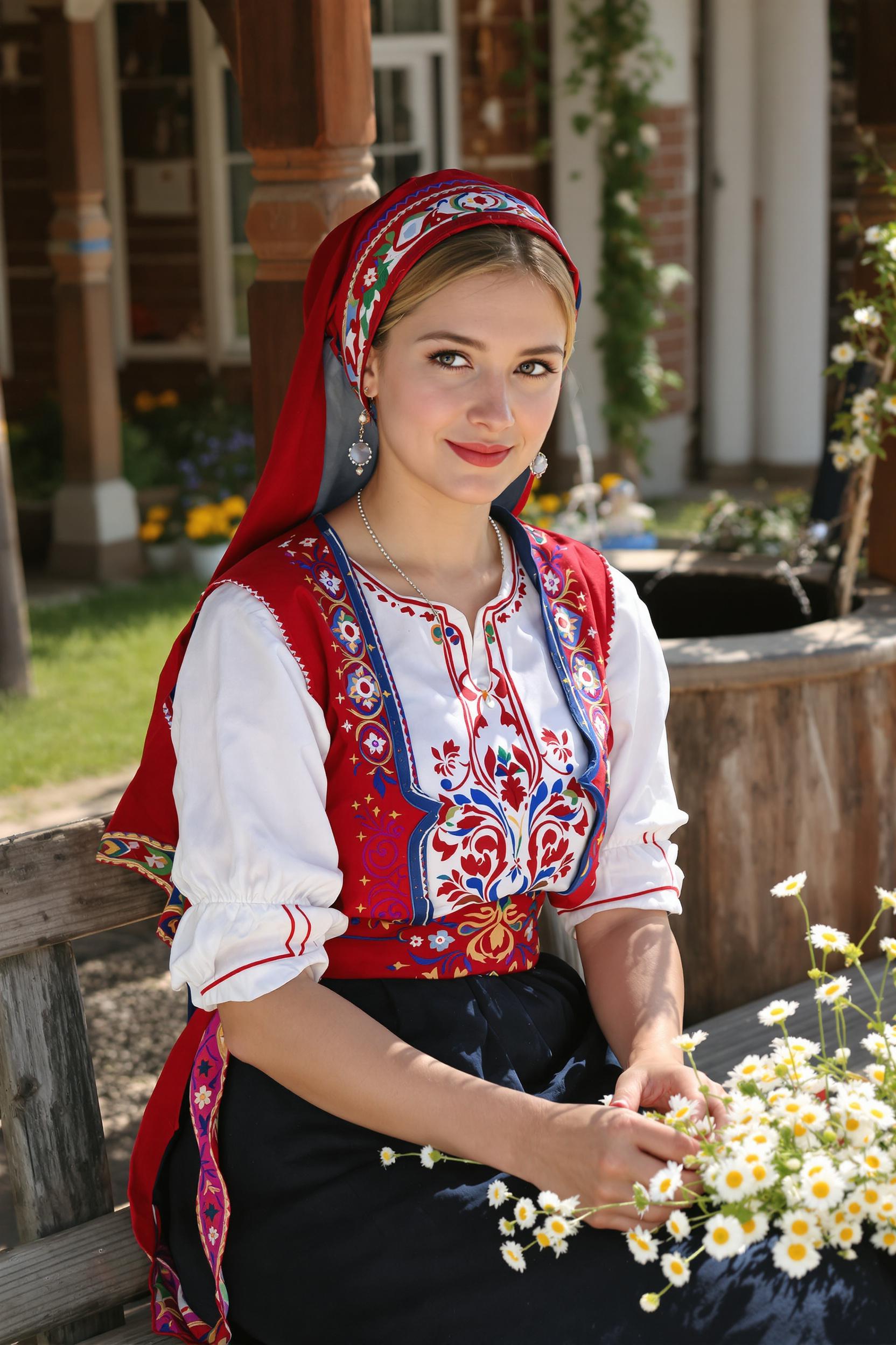Молодая женщина в расшитом красно-синем сарафане с белой рубахой и традиционным платком на голове сидит на деревянной скамье возле колодца, плетёт венок из ромашек, но внимательно и дружелюбно смотрит прямо в камеру. Летнее солнце, акцент на лице и наряде.
