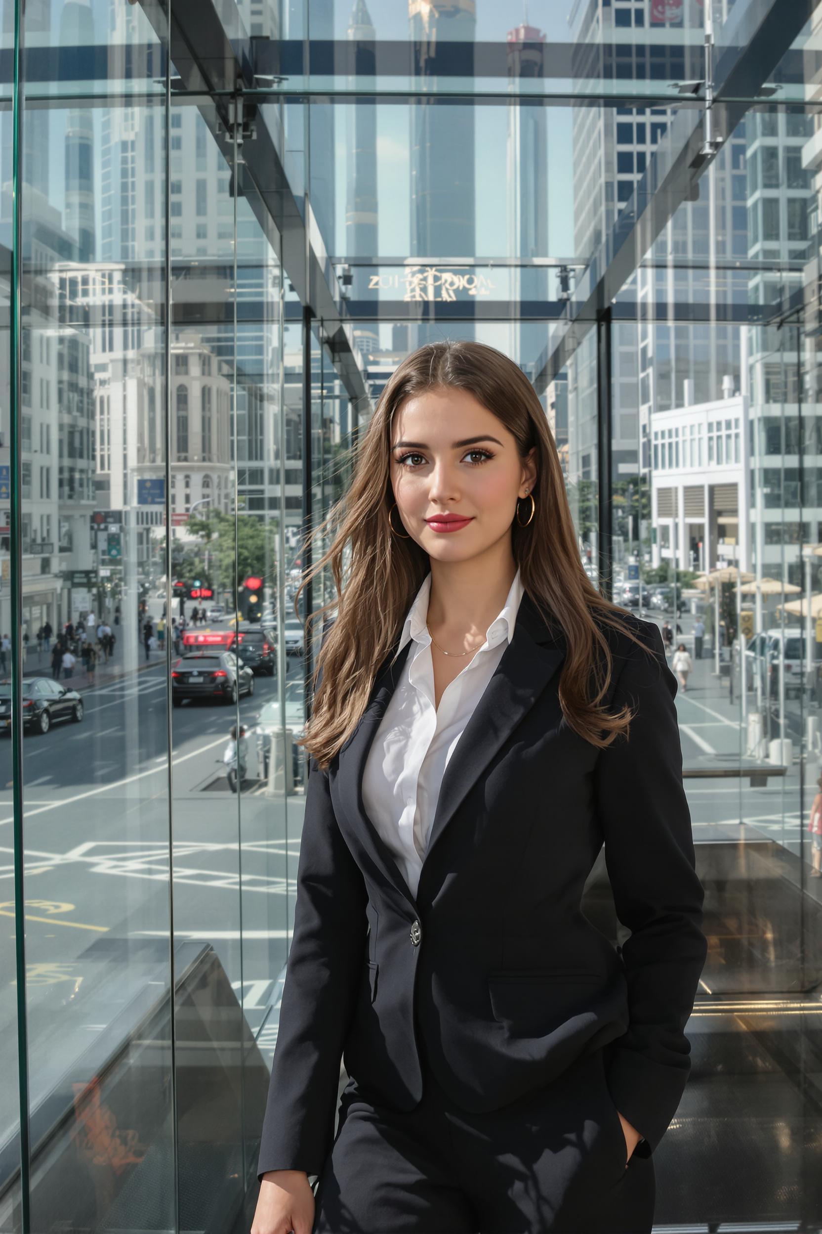 Молодая женщина в стильной деловой одежде стоит у выхода из стеклянного метро в центре Дубая, позади оживленная улица и современные высотки, она уверенно смотрит в камеру, мягкий дневной свет, средний план.