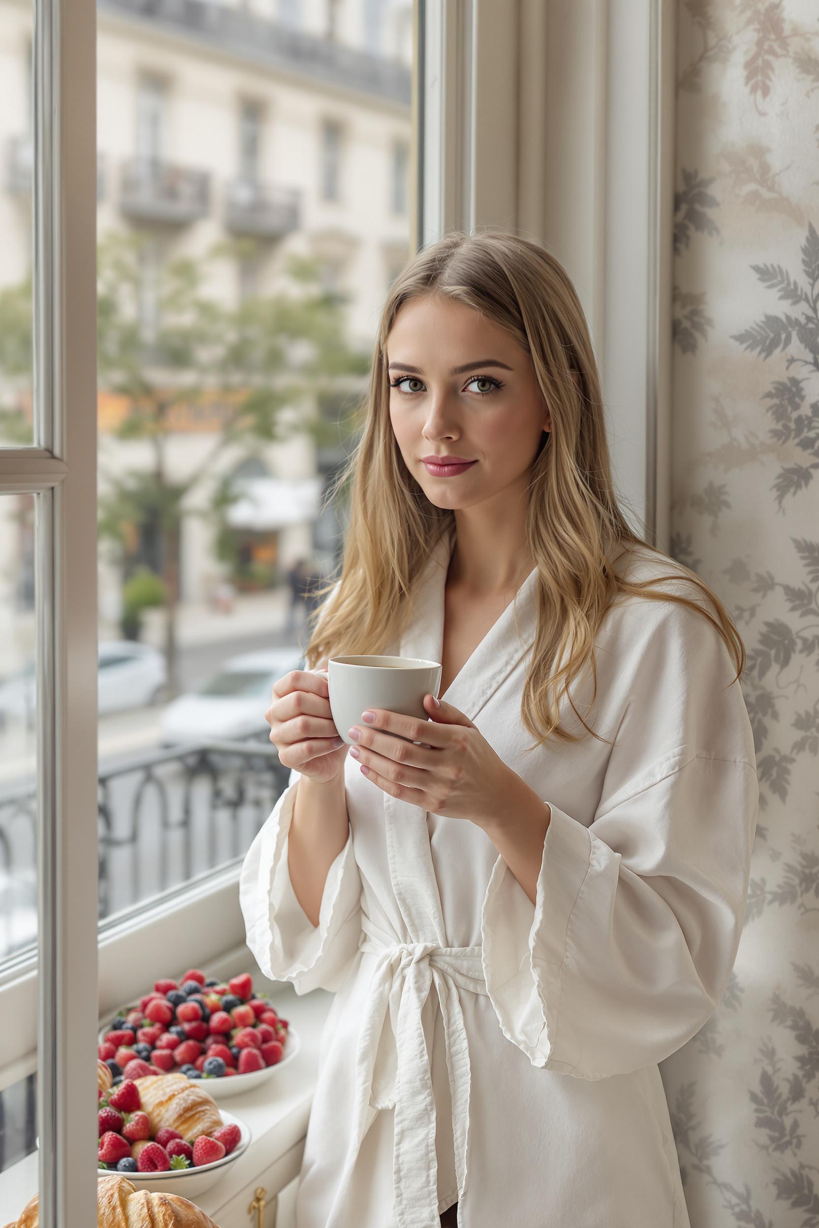 Молодая женщина в светлом халате стоит у окна с видом на улицы Парижа, в руках чашка кофе, на подоконнике круассаны и свежие ягоды. Она непринуждённо смотрит в камеру, на лице естественный макияж, лёгкое утро, романтичная атмосфера.