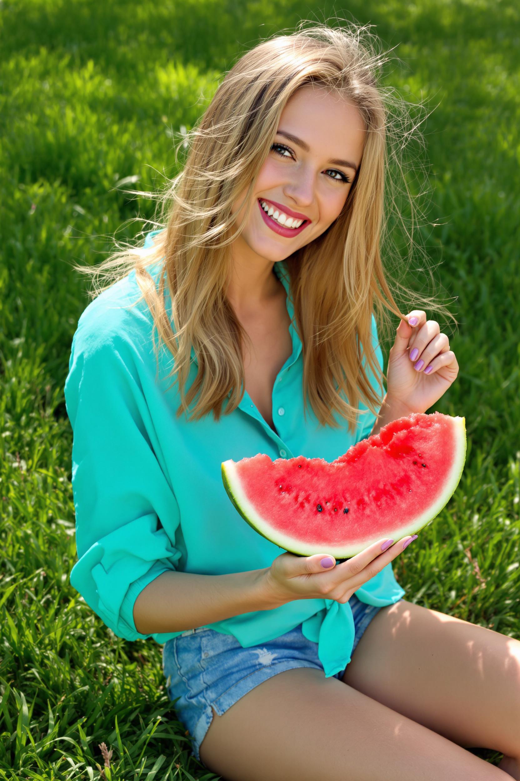 Женщина в свободной бирюзовой рубашке и джинсовых шортах держит в руках большой ломтик арбуза, она смеётся, глядя в камеру. Позади зелёная лужайка, солнечные лучи играют в её волосах. Средний план, акцент на радости и лёгкости летнего дня.