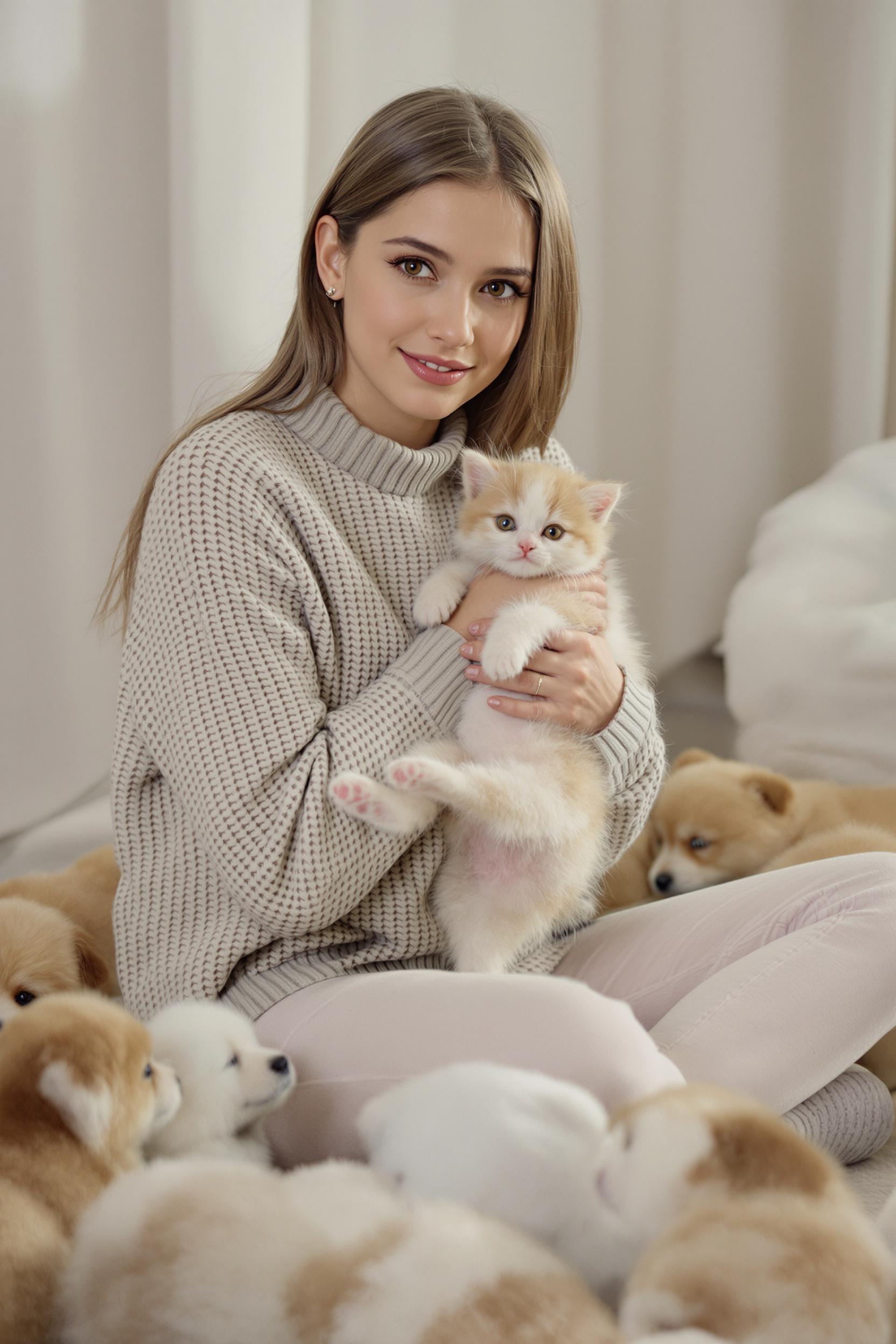 Молодая женщина в уютном свитере сидит на полу яркой комнаты, на руках держит пушистого котенка и смотрит в камеру, вокруг несколько милых щенков, теплое мягкое освещение, атмосфера уюта.