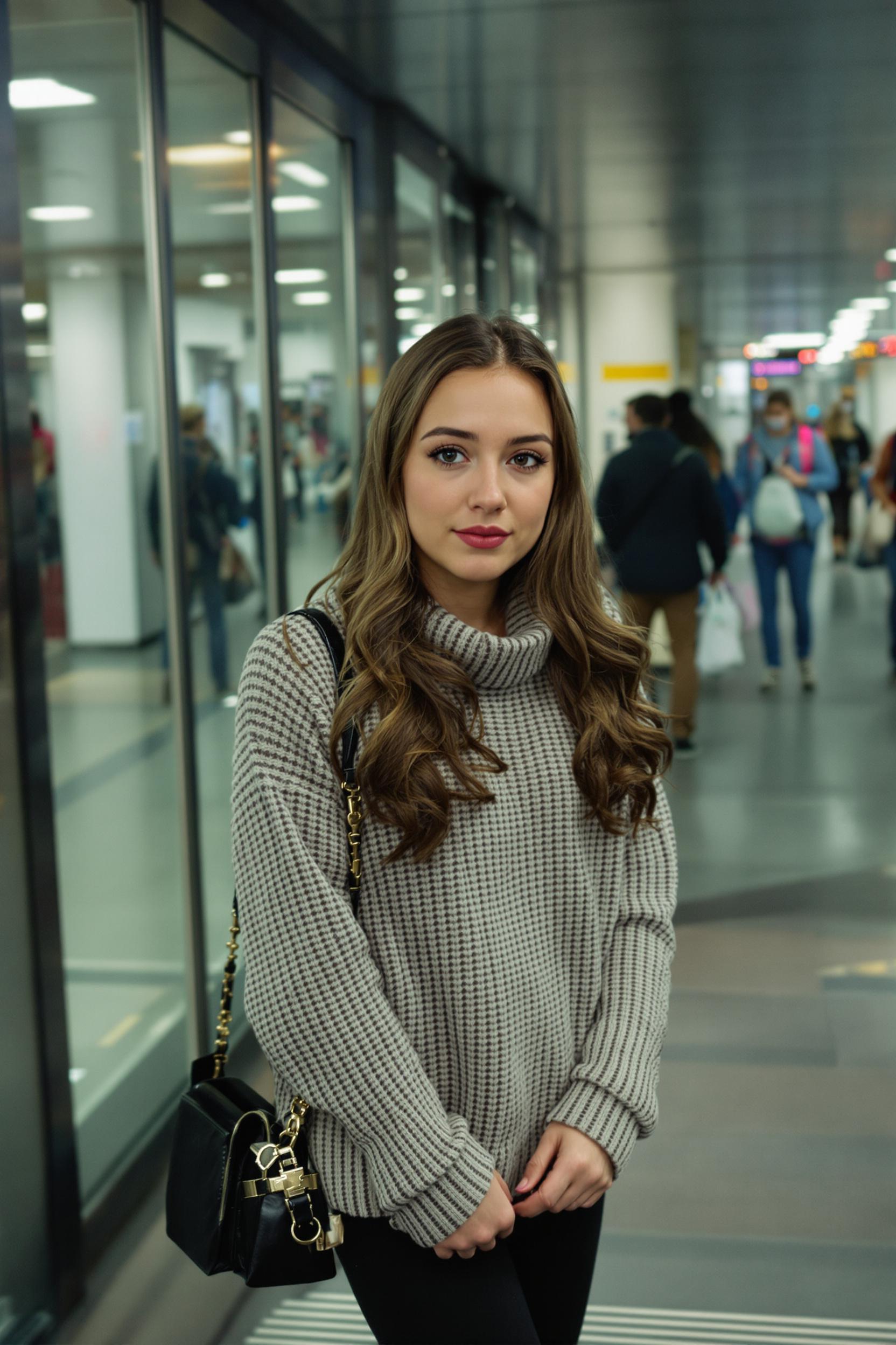 Молодая женщина в уютном свитере стоит на ступенях у станции современного городского метро, смотрит прямо в камеру, на заднем плане стеклянные двери и спешащие прохожие, атмосфера урбанистической ежедневной суеты.