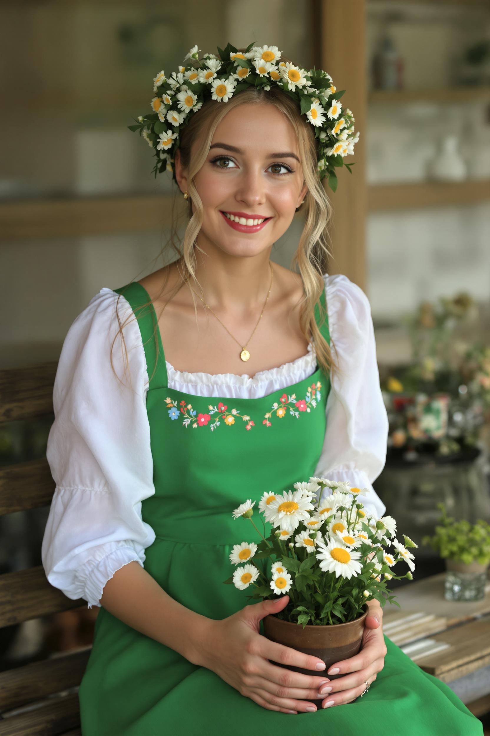 Молодая женщина в ярком зелёном сарафане с вышитыми узорами и белой рубахе, на голове — венок из луговых цветов. Она сидит на деревянной скамье у русской печи, в руках держит горшок с цветущими ромашками и с нежной улыбкой смотрит прямо в камеру. Средний план, уютный свет.