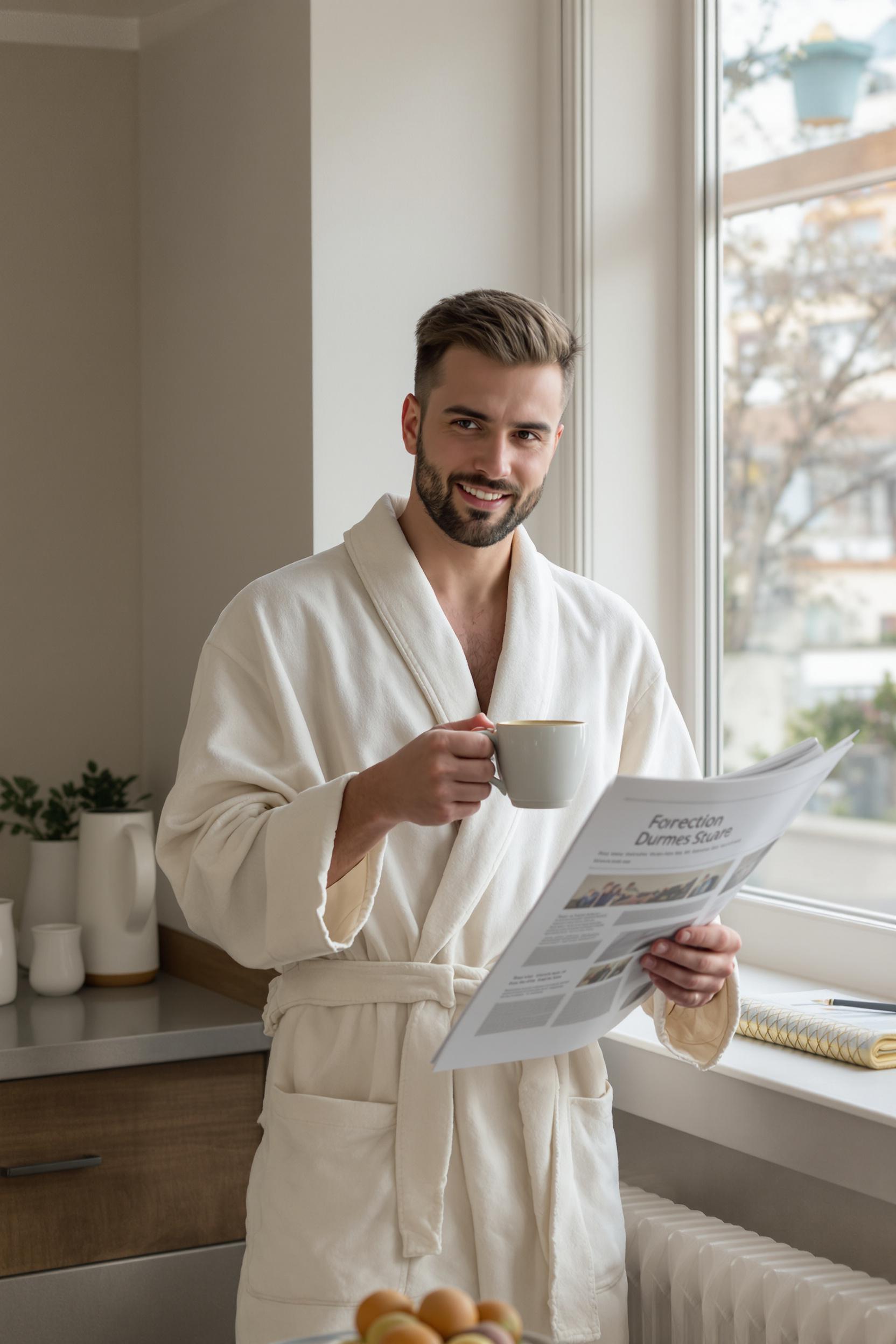 Молодой человек в кремовом халате стоит на кухне у большого окна, в руках держит чашку эспрессо и читает утреннюю газету, смотрит в камеру с легкой улыбкой, мягкий рассеянный утренний свет, аккуратный завтрак на фоне, естественный макияж.